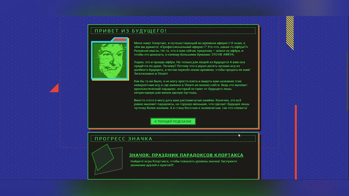 На главной странице в магазине Steam появился баннер с повторяющейся надписью «Развлечения сюда». Если щёлкнуть на него ЛКМ, то пользователь попадёт на страницу квеста. В кратком описании будет указано, что Клортакст — аферист, который готов продать игроку популярные игры из будущего.