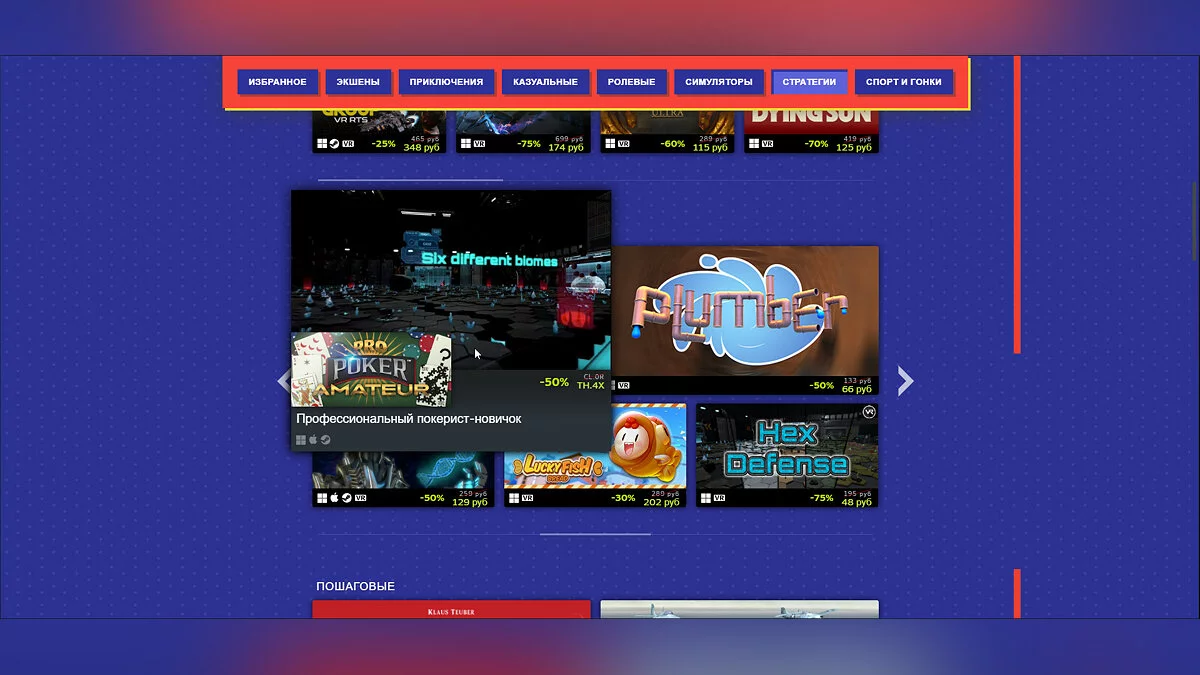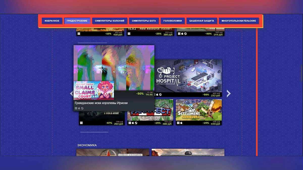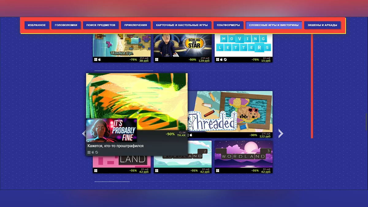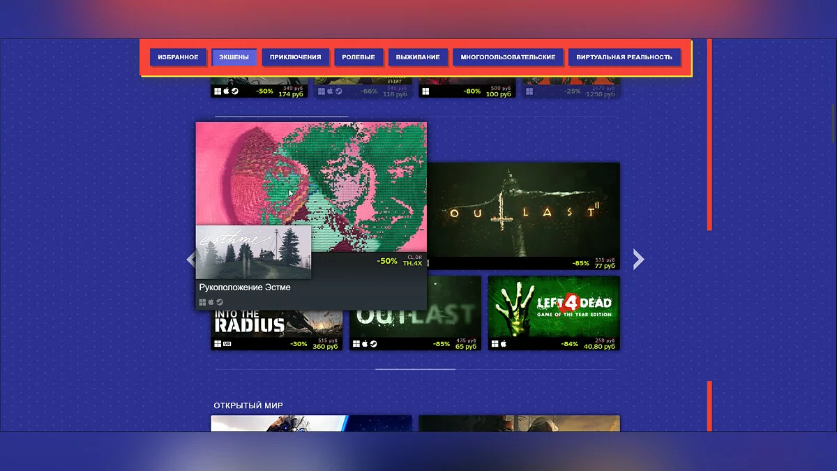 Примечание: Игры могут исчезнуть из указанных ниже разделов, поэтому при отсутствии подходящего проекта по нашей инструкции переключайтесь между вкладками магазина и просматривайте каждый раздел с помощью стрелок. Логики в нахождении правильной игры не существует, однако подсказка поможет понять, что изображено на постере и к какой тематике относится проект.