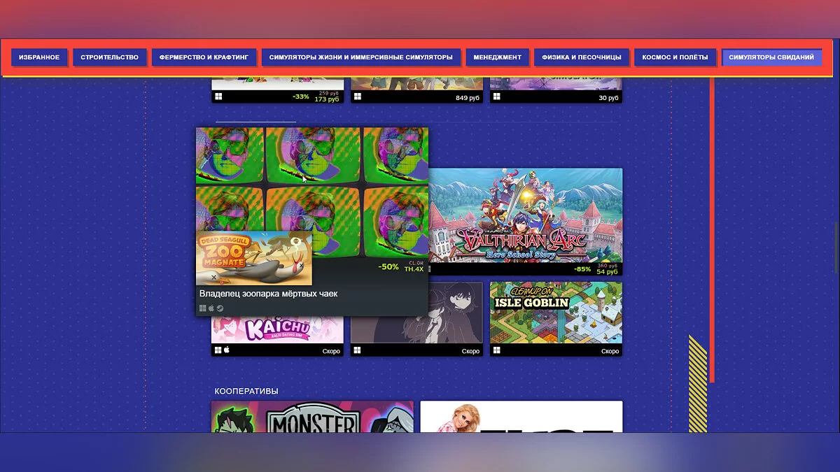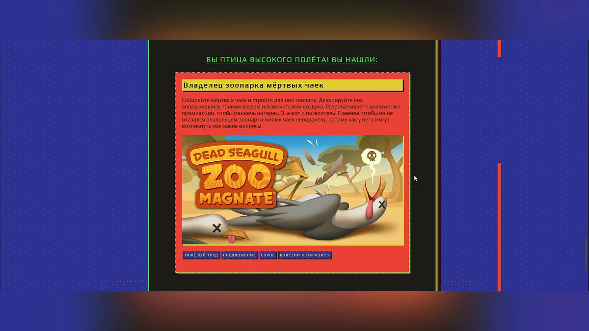 - Решение: отыскали игру «Владелец зоопарка мёртвых чаек» во вкладке «Симуляторы свиданий» в разделе «С поддержкой контроллеров». На карточке игры изображены мёртвые птицы в сафари с надписью «Dead Seagull Zoo Magnate».
