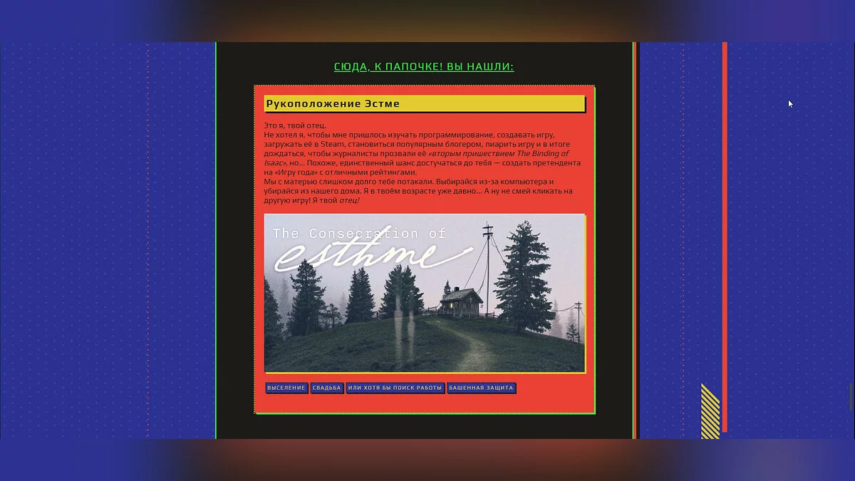 - Решение: нашли проект «Рукоположение Эстме» во вкладке «Экшены» в разделе «Хорроры на выживание». На постере изображена хижина возле леса с надписью «The Consecration Of Esthme».