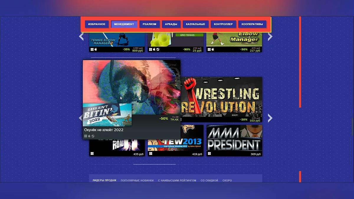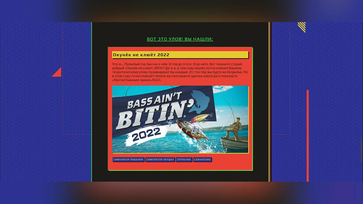 - Решение: нашли игру «Окунёк не клюёт 2022» во вкладке «Менеджмент» в разделе «Реслинг и файтинги». На карточке игры изображён мужчина на лодке, который поймал рыбу в море с надписью «Bass Ain't Bitin' 2022».