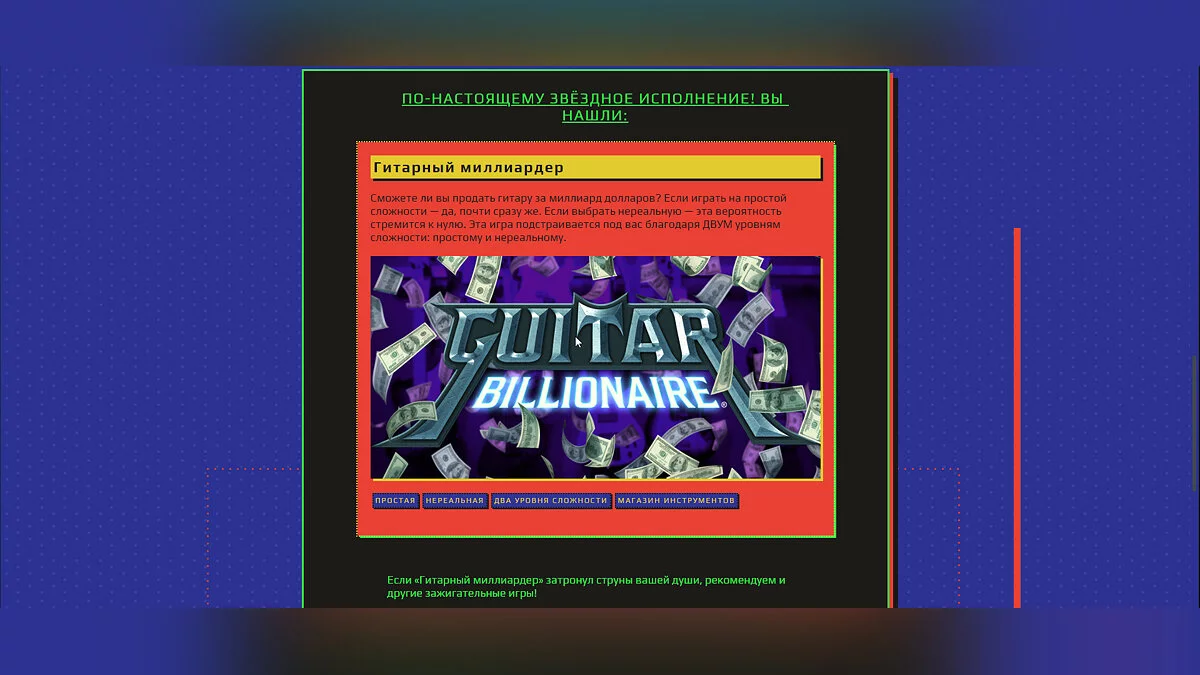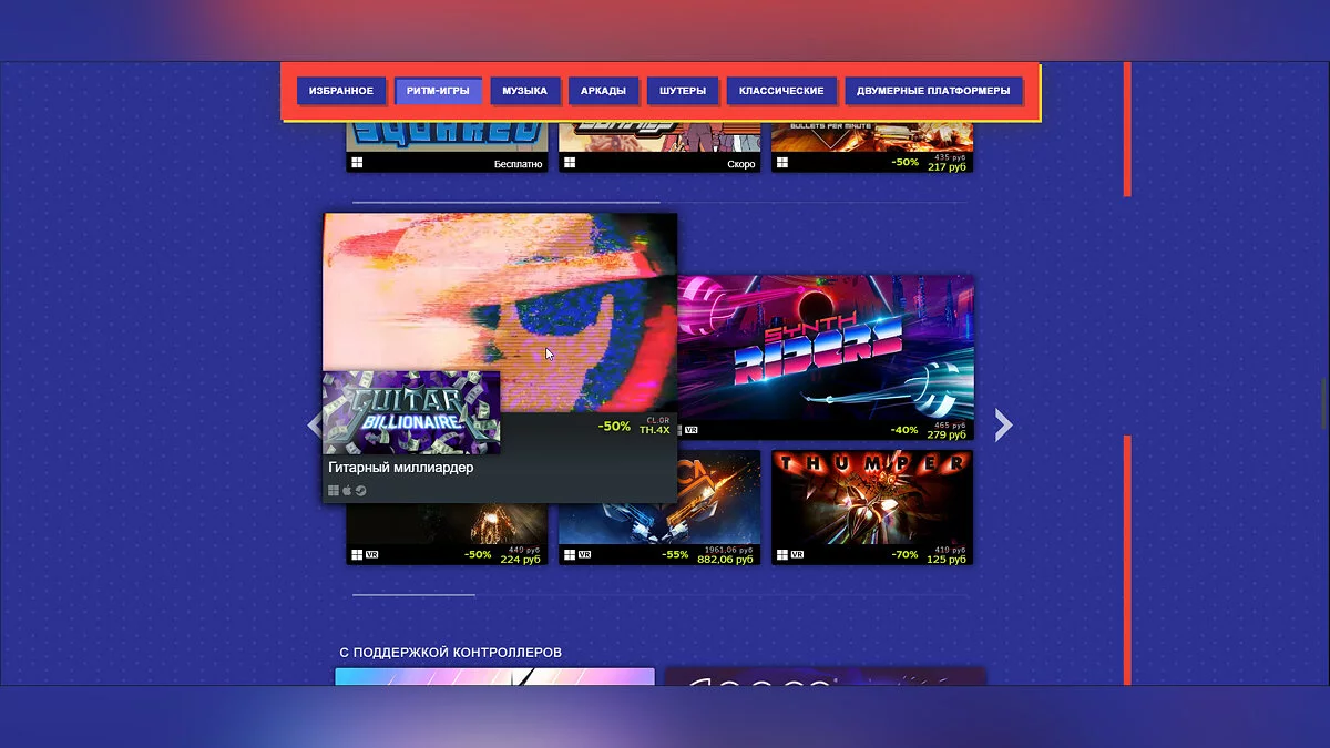 - Решение: нажимаем на вкладку «Ритм-игры» и листаем страницу немного вниз. Перед разделом «С поддержкой контроллеров» найдём подходящую игру «Гитарный миллиардер». На постере изображены деньги на фиолетовом фоне с надписью «Guitar Billionaire».