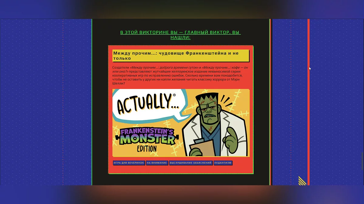 - Решение: разыскали подходящий проект «Между прочим...: чудовище Франкенштейна и не только» во вкладке «Экшены» в разделе «Remote Play Together: для игры с друзьями по сети». На карточке игры изображён Франкенштейн в халате доктора с надписью «Actually... Frankenstein's Monster Edition».