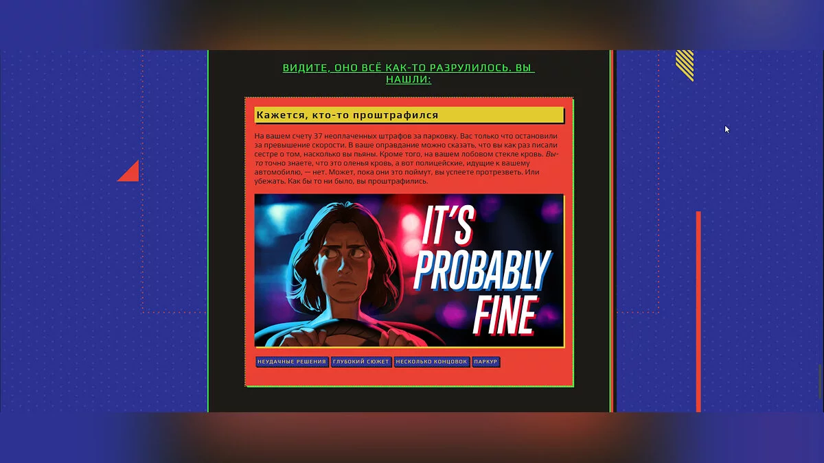 - Решение: нашли игру «Кажется, кто-то проштрафился» во вкладке «Словесные игры и викторины» в разделе «Point & Click». На постере проекта изображена девушка за рулём автомобиля с надписью «It's Probably Fine».