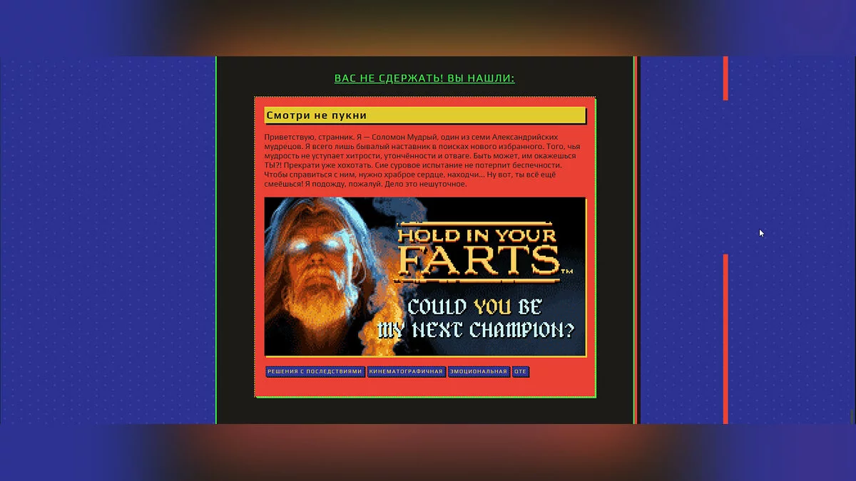 - Решение: нашли проект «Смотри не пукни» во вкладке «Пошаговые» в разделе «Открытый мир». На постере изображён старец с сияющие глазами с надписью «Hold In Your Farts. Could You Be My Next Champion».