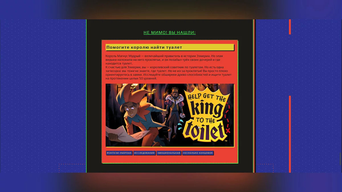- Решение: отыскали игру «Помогите королю найти туалет» во вкладе «Групповые ролевые игры» в разделе «Фэнтези». На постере изображён король с туалетной бумагой в руках, идущий следом за шутом с надписью «Help The King Get To The Toile».