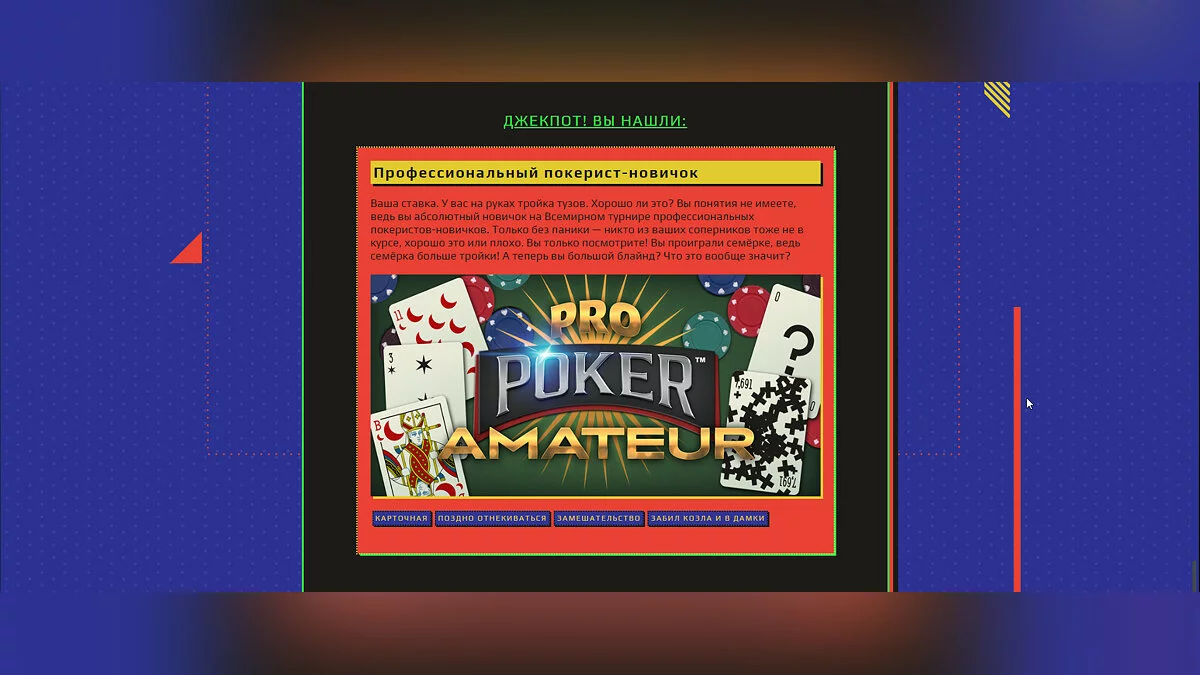 - Решение: игра «Профессиональный покерист-новичок» во вкладе «Стратегии» в разделе «В реальном времени». На постере изображены карты с покерными фишками с надписью «Pro Poker Amateur».