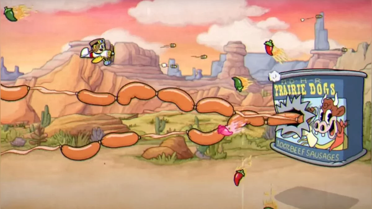 Не приближайтесь к боссу слишком близко, иначе получите урон. Пока корова находится на земле, она будет выпускать банки с сосисками. Предметы создают вертикальные препятствия на арене, которых лучше избегать.
