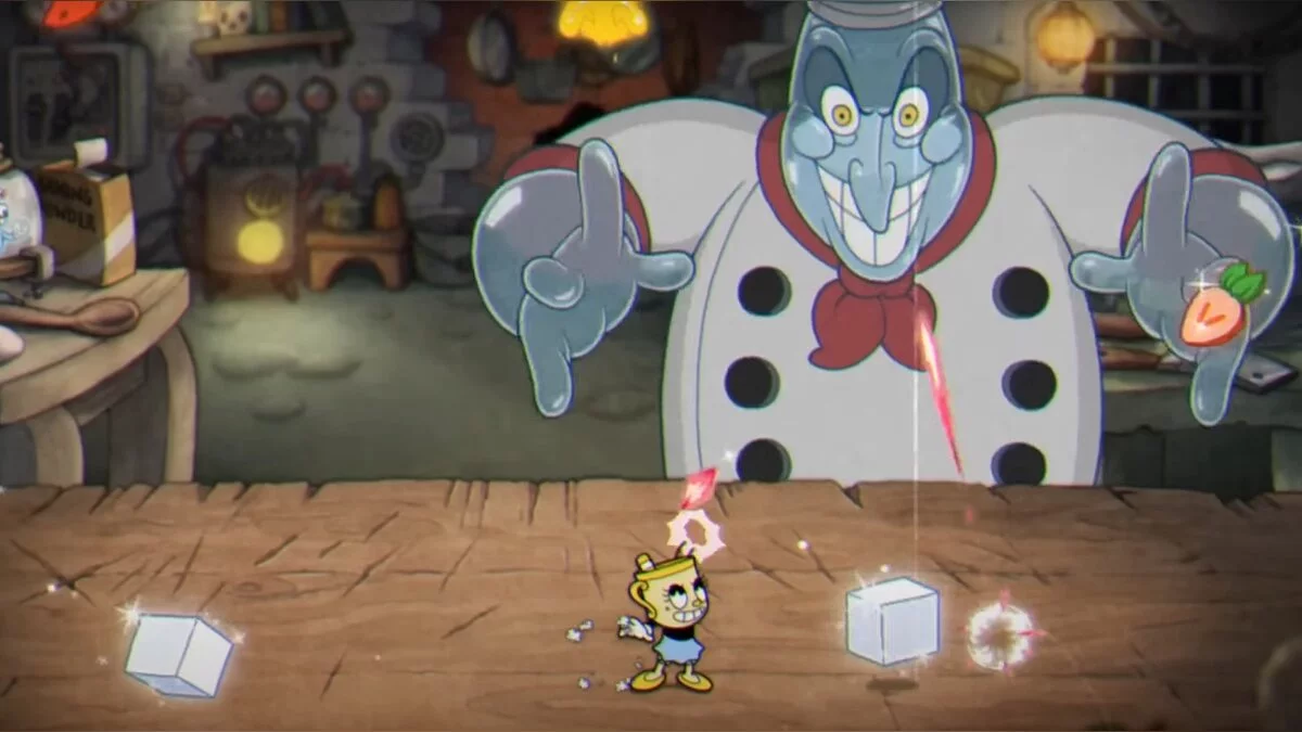- Когда снеговик превратится в холодильник, он начнёт бросаться в героя кубиками льда, каждый из которых расколется на два маленьких. Подойдите поближе к боссу, а когда он выпустит снаряды — бегите в дальний конец локации.