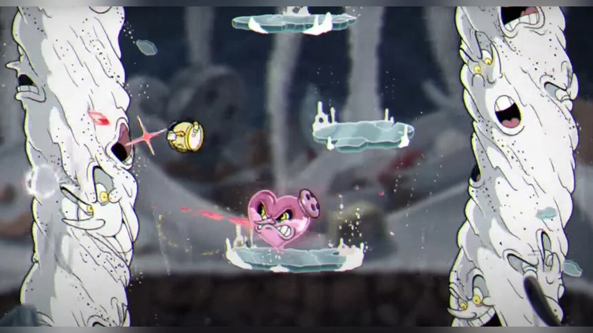 - Когда босс откроет крышку у себя на подбородке, из неё начнут вылетать вёдра. Предметы летят медленно и не представляют опасности, пока не коснутся конца экрана и не превратятся в три полумесяца, которые будут лететь по диагонали. Чтобы не попасть под их атаку, бегите в противоположную сторону.