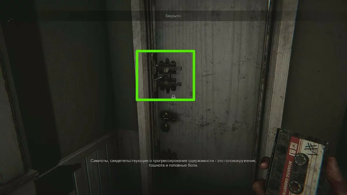 На окне напротив комнаты появится кассета №3. Пройдите через кухню в туалет и примените болторез на унитазе. Так вы получите блок цемента. Сразу после этого вы услышите голоса. Подождите завершения диалога, найдите череп с рогами и сфотографируйте его. Спуститесь в подвал, выключите генератор. Коридор слева от места, где висел череп, изменится.