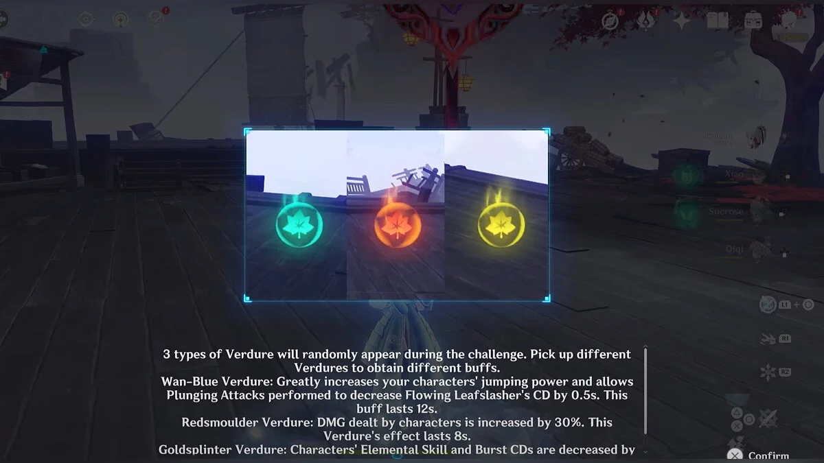 В третьем испытании нужно одолеть мини-босса, известного как Страж Руин. Здесь вы можете воспользоваться листьями разного цвета, которые будут появляться на карте случайным образом: