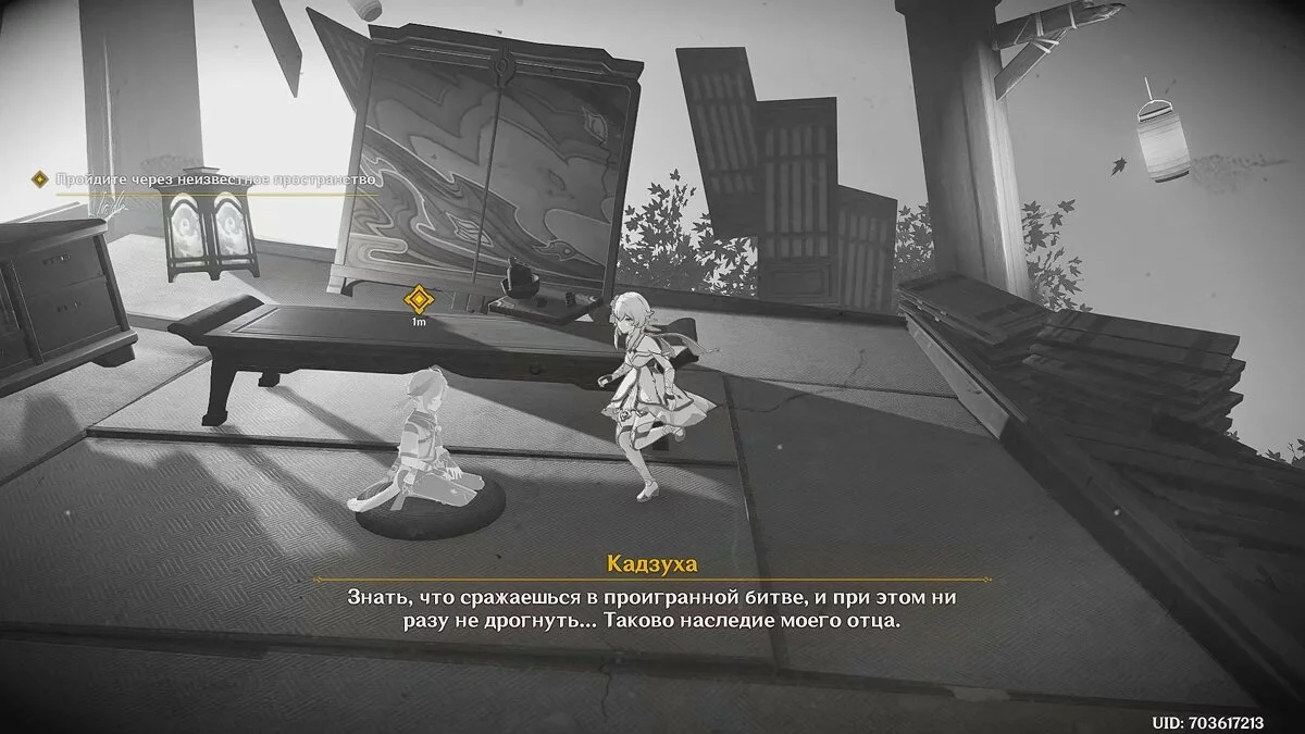 Снова переверните комнату и вставьте предмет в святилище. Прослушайте диалог Кадзухи со своим отцом, после чего бегите в додзё и сразитесь с единственным самураем.