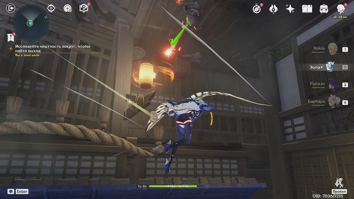 Найдите омамори и вставьте его в святилище. В центре комнаты появится воздушный поток. С его помощью поднимитесь на верхний уровень локации.