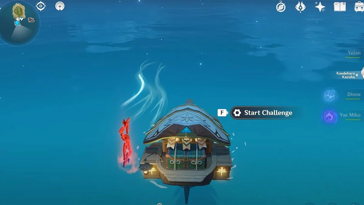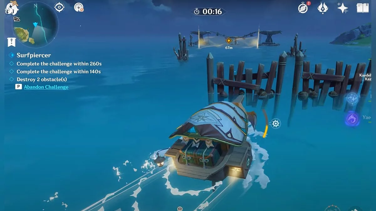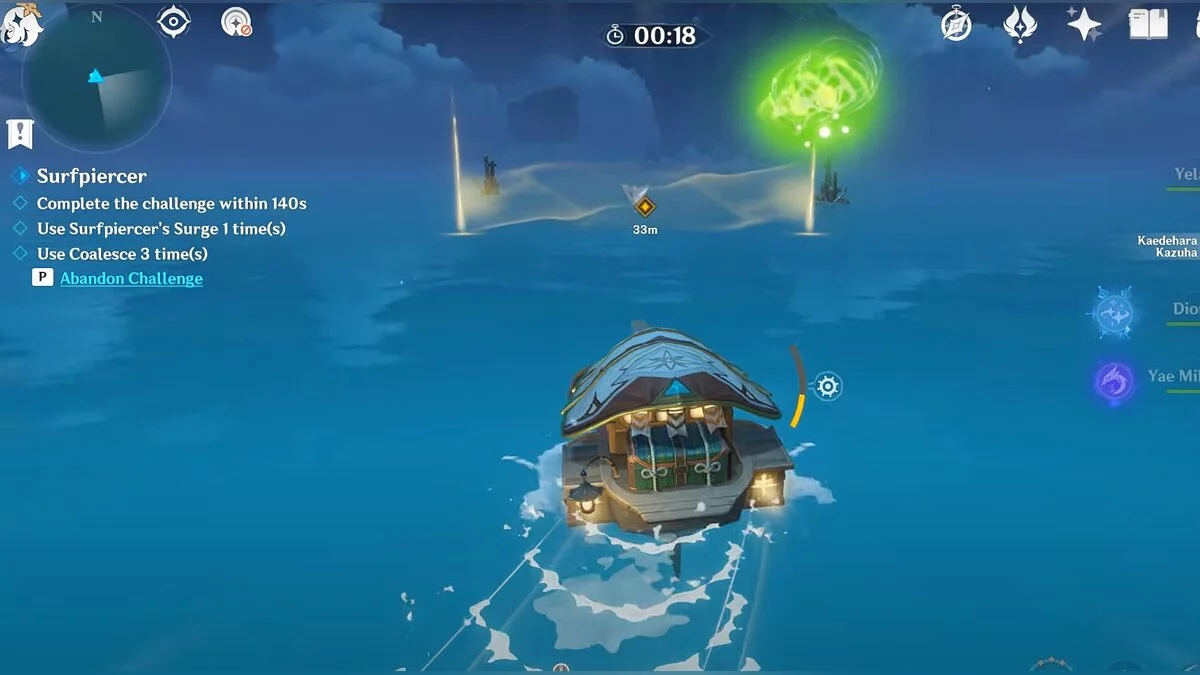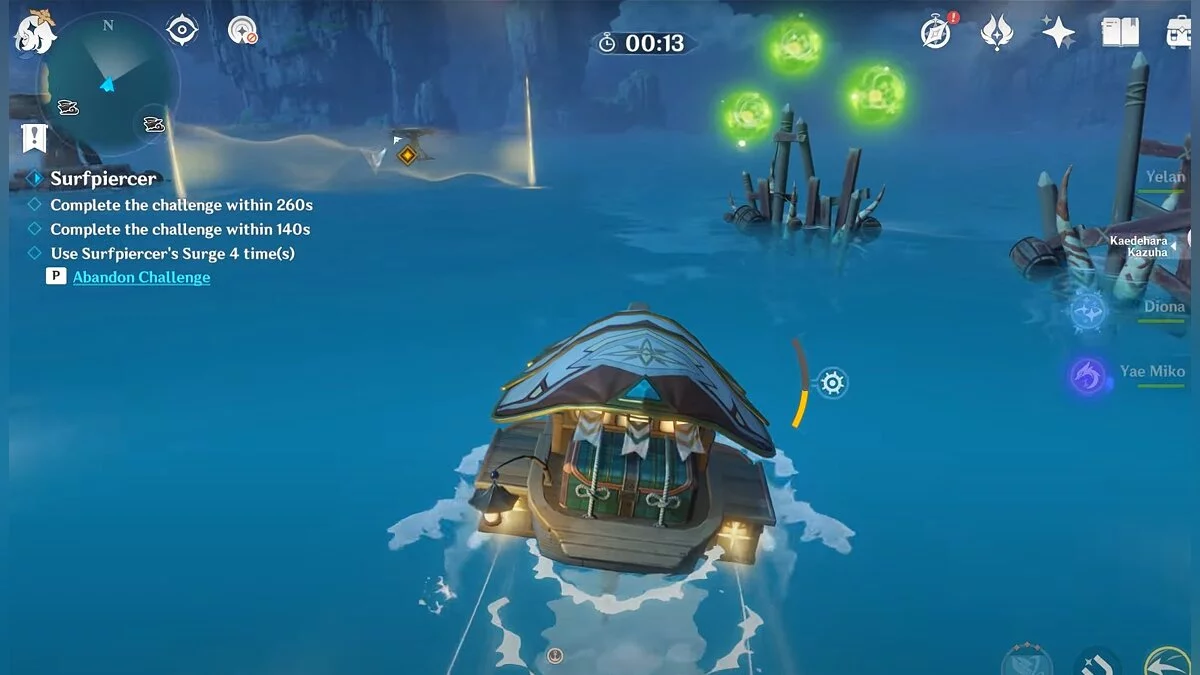 Вызовите волноход и садитесь за штурвал. Взаимодействуйте с красным буйком, чтобы начать испытание. Вас ждёт заплыв по контрольным точкам. Обратите внимание на зелёные энергетические сферы, которые восстанавливают способность «Ускорение». Если они находятся выше волнохода, нажимайте на кнопку, которая отвечает за элементальный навык, чтобы притянуть их к себе.