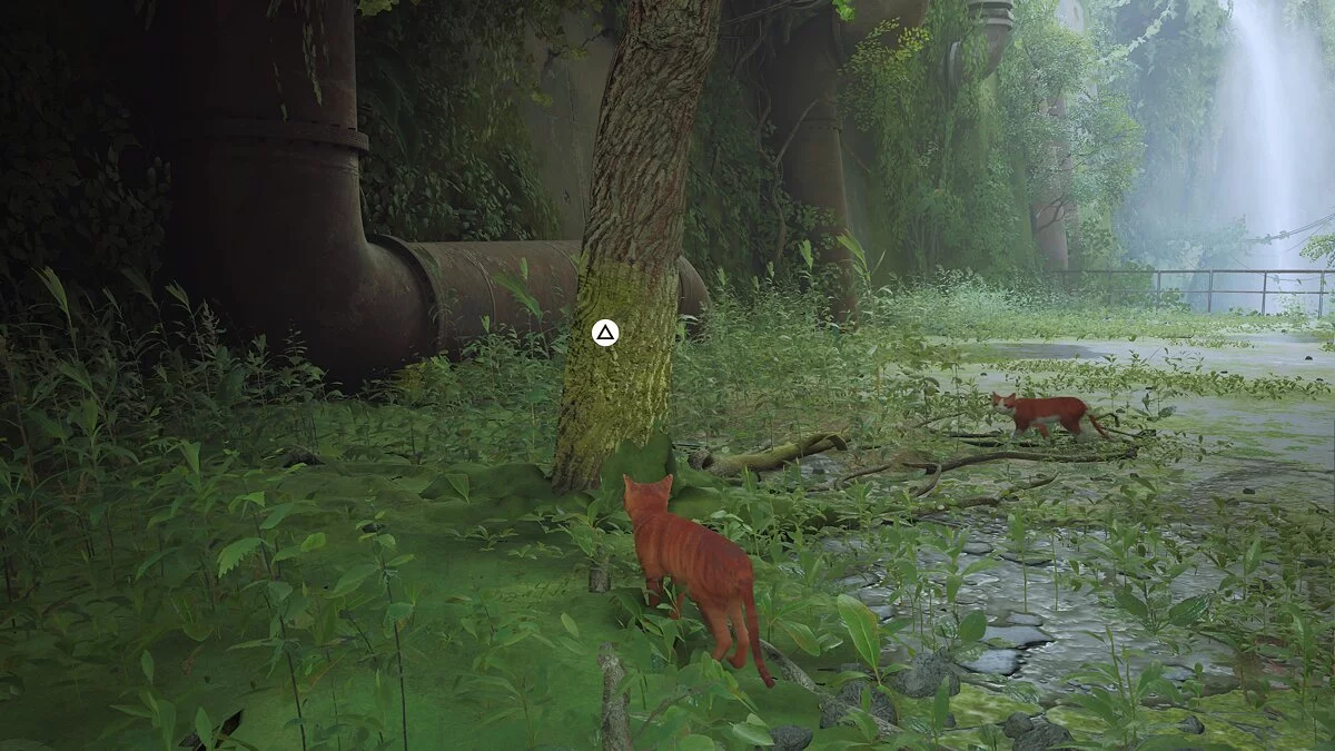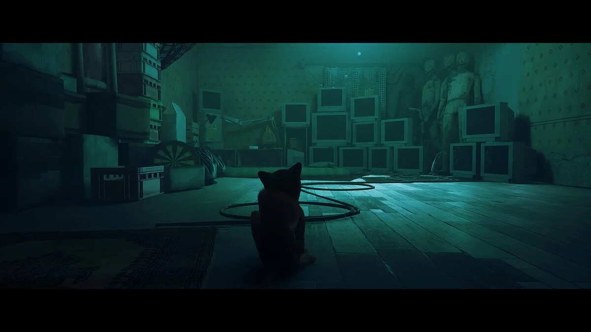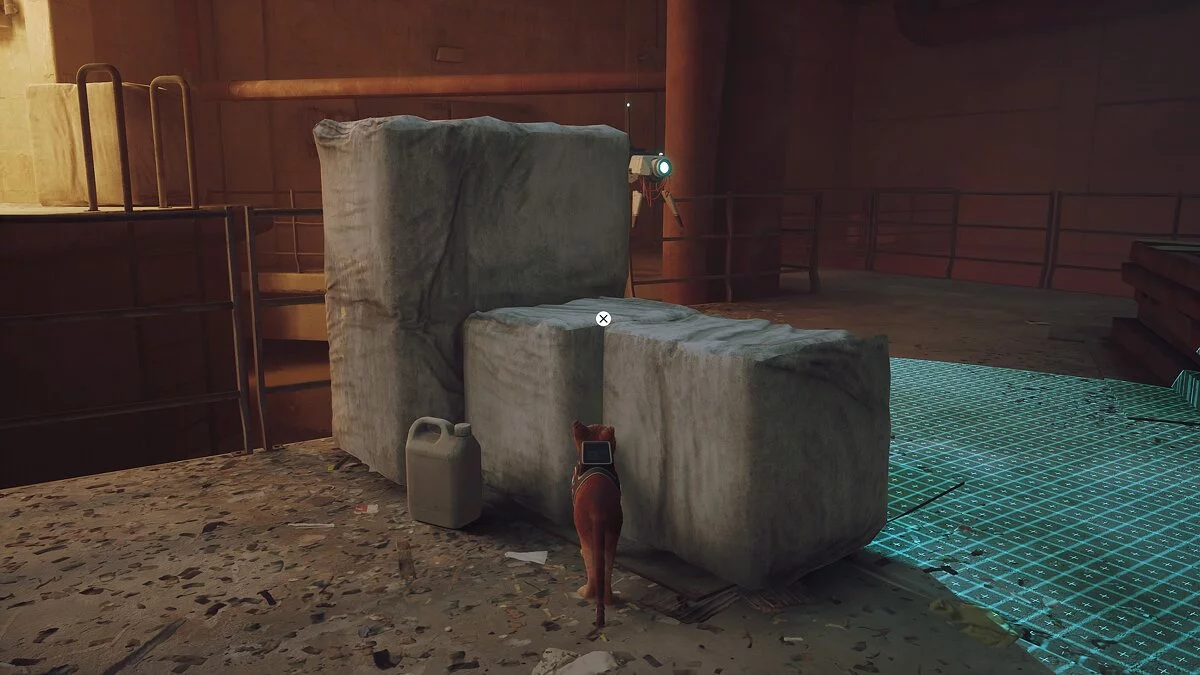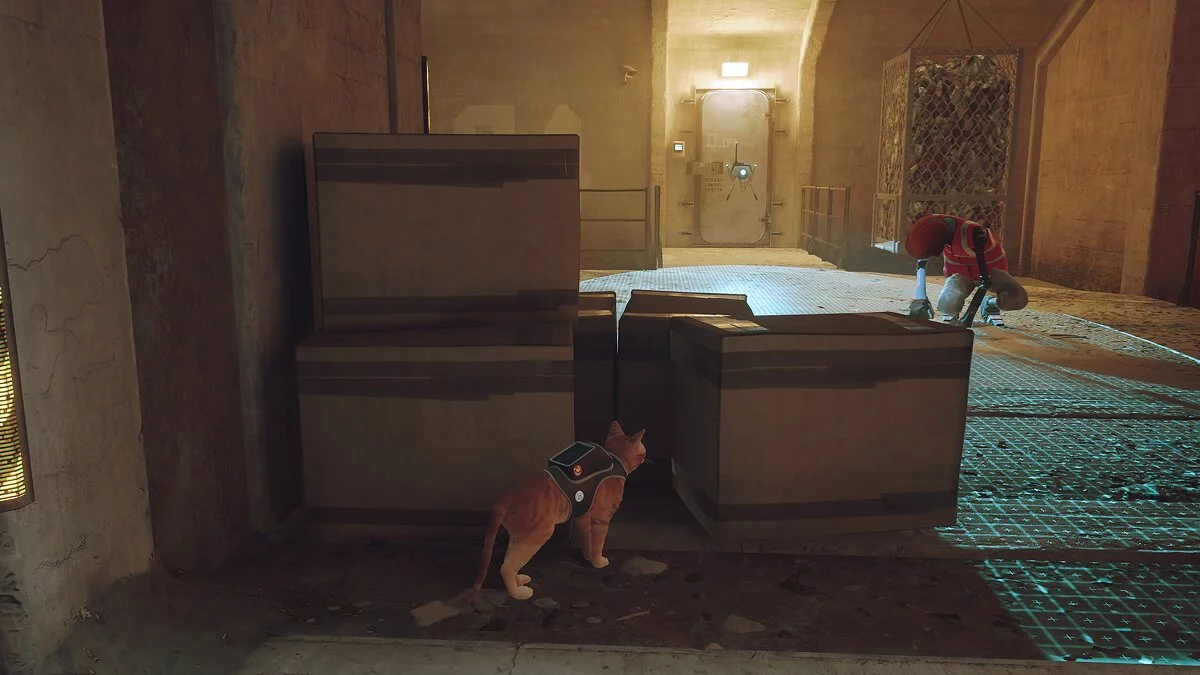 В самом начале главы котик должен добраться до гаража, где ему предстоит поговорить с роботом. После общения Хранитель откроет запертое помещение. Перед четырьмя сидящими роботам на полу лежит ковёр для заточки когтей.