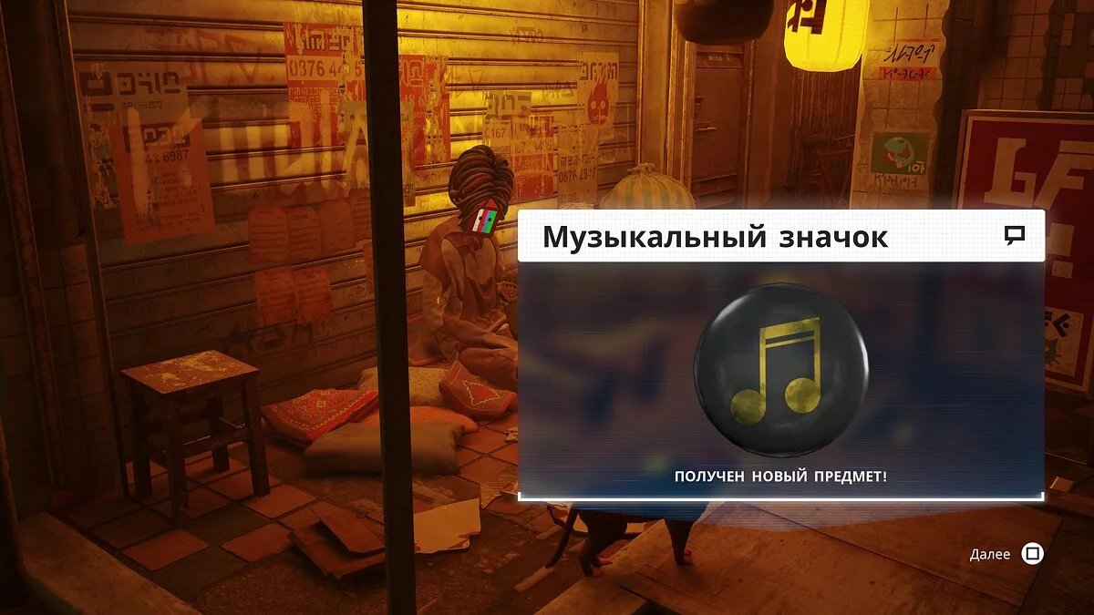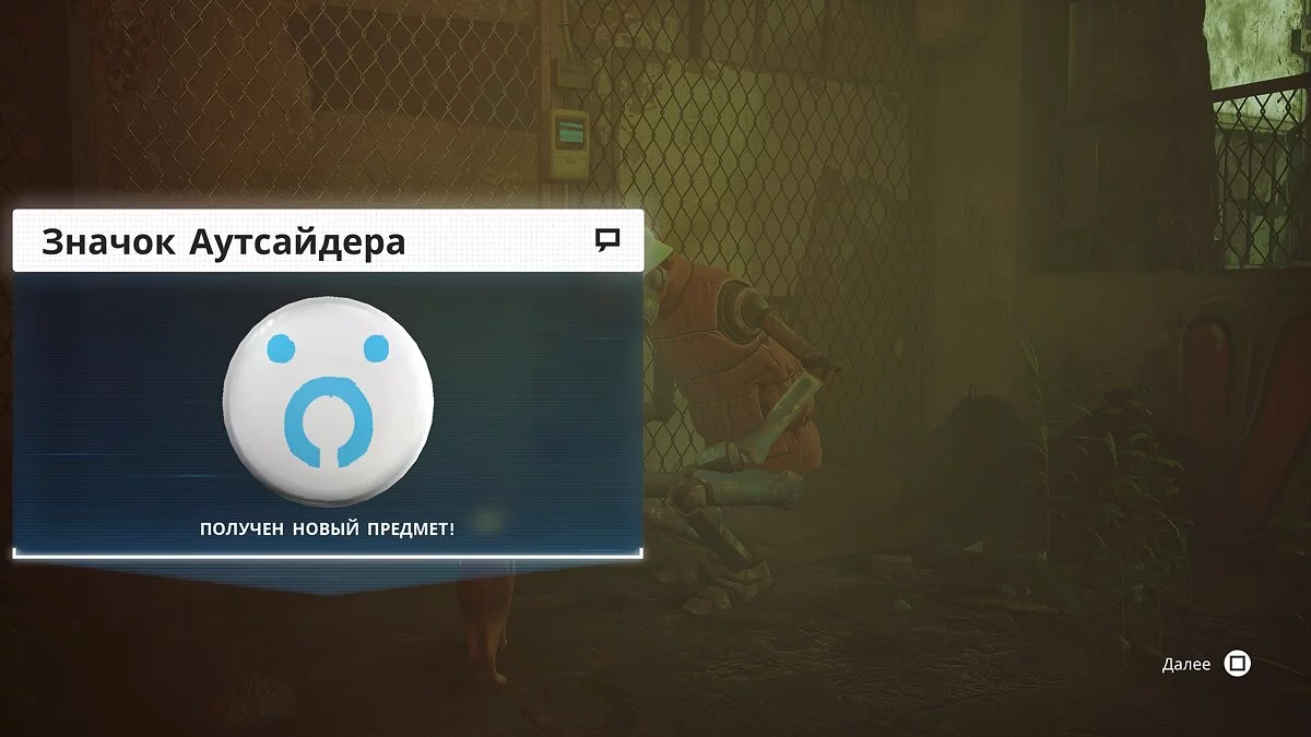 Напротив ресторана расположена большая голограмма робота. Позади него спускаемся по большой лестнице и сразу же сворачиваем в узкий переулок. Забираемся наверх по кондиционерам, трубам и платформам. Перелезаем через небольшое окошко с решёткой. Осматриваем мёртвого робота для получения значка.