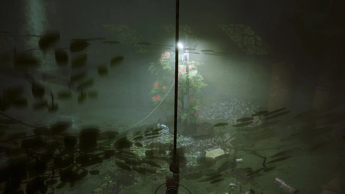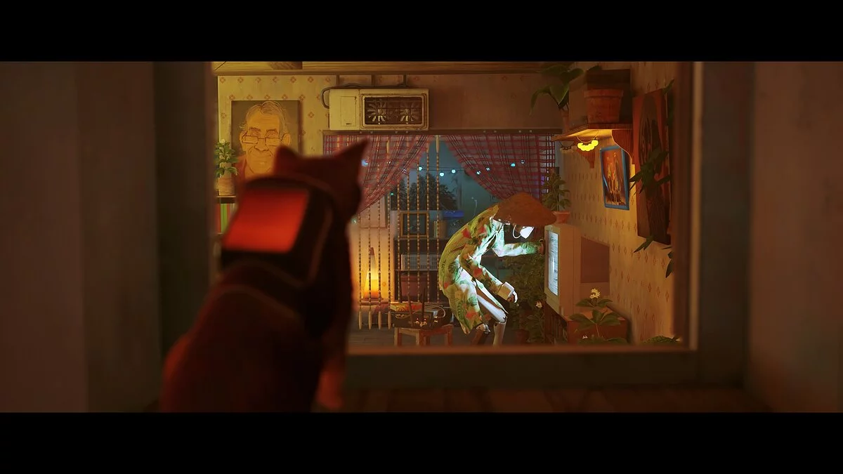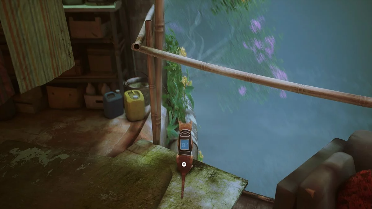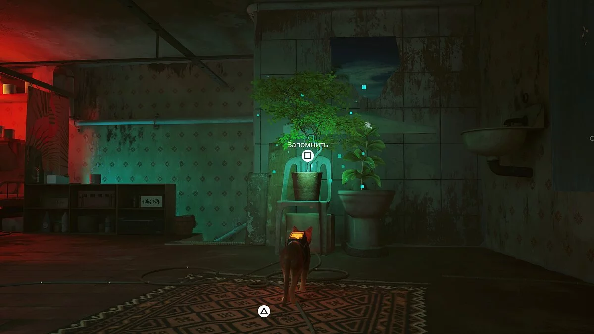 Слезаем с балкона вниз и возвращаемся к Бабушке. Подходим и царапаем дверь, которая находится справа от двух роботов, сидящих в одеялах. Как только она откроется, забираемся внутрь квартиры, поднимаемся на второй этаж и осматриваем цветок, чтобы открыть новое воспоминание.