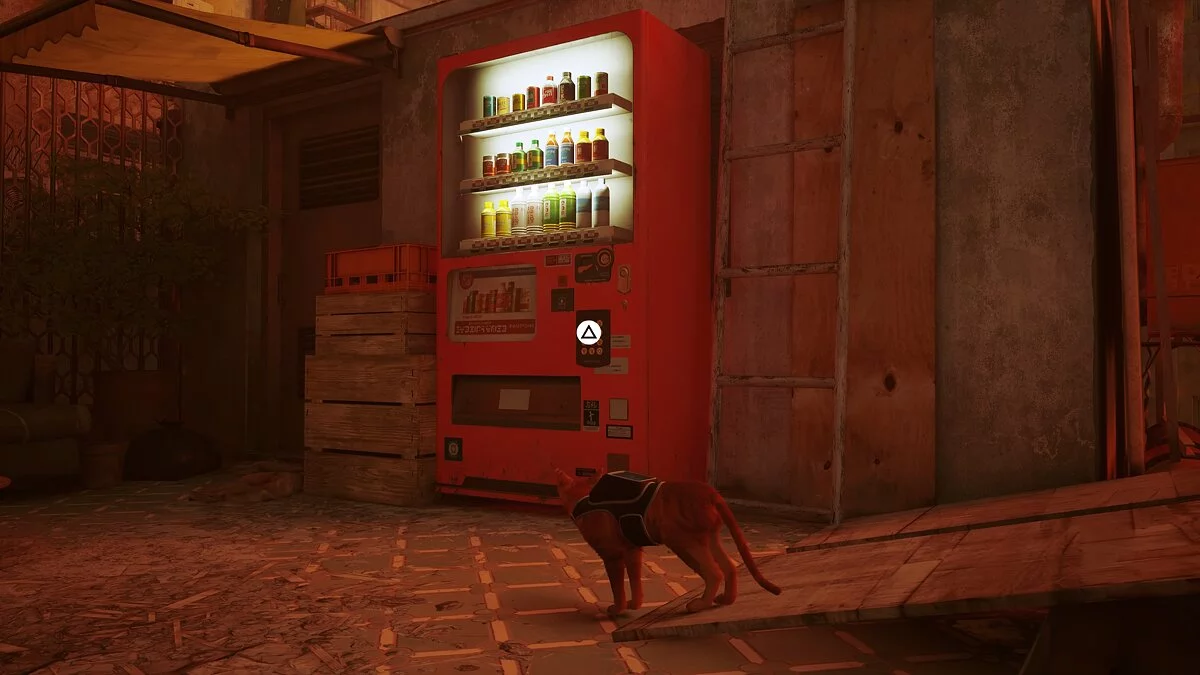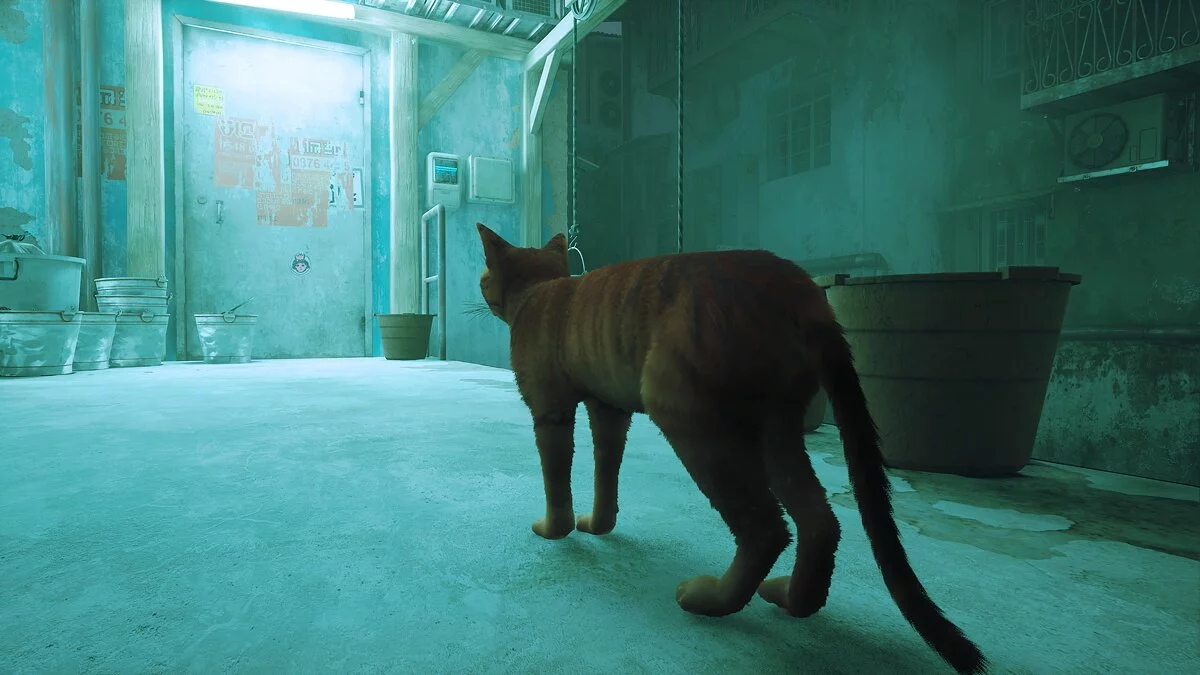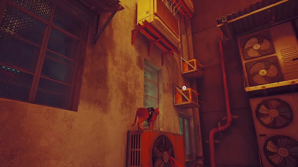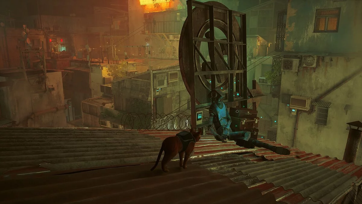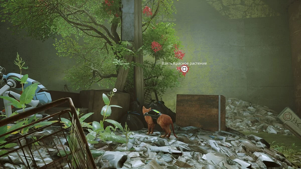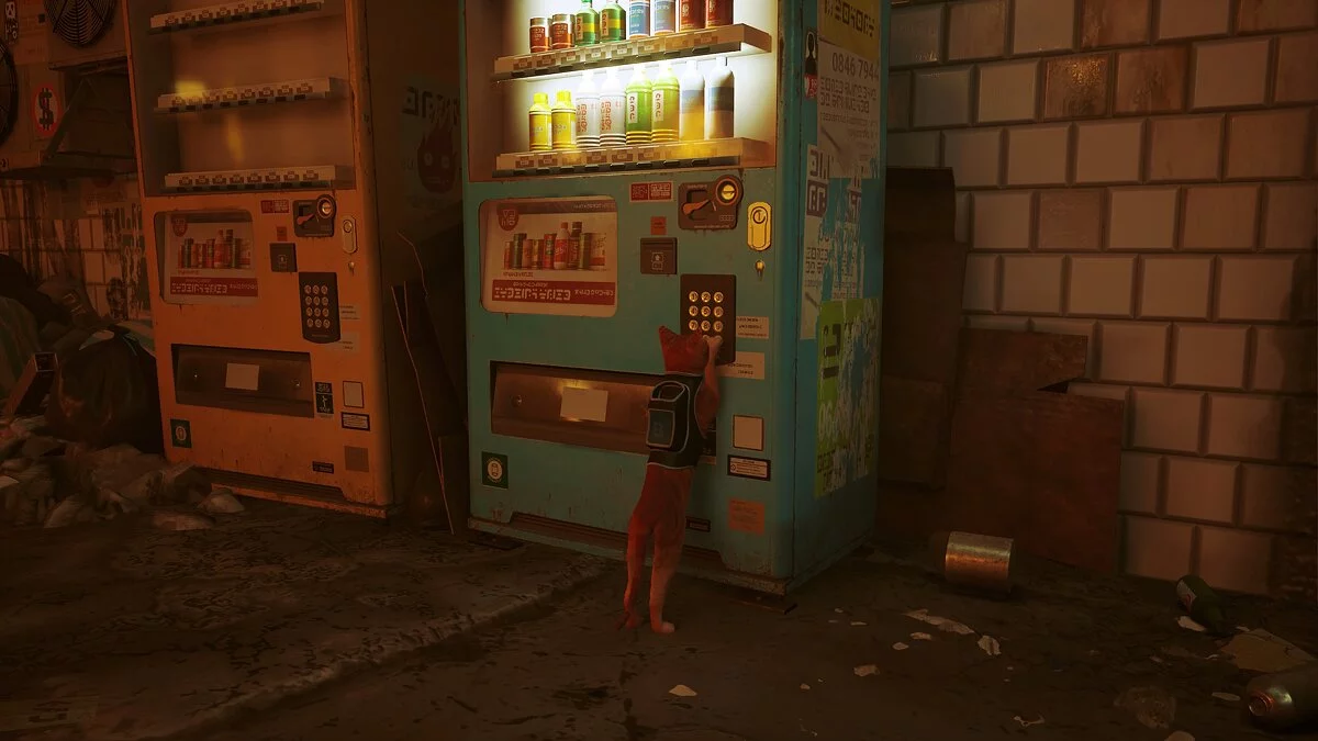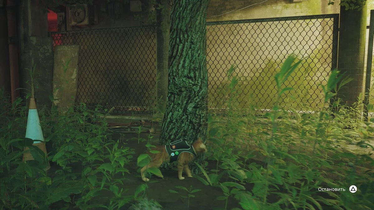 В этом же месте трёмся об робота. Здесь игроку откроется достижение, если ранее котик потёрся об четырёх жителей трущоб.