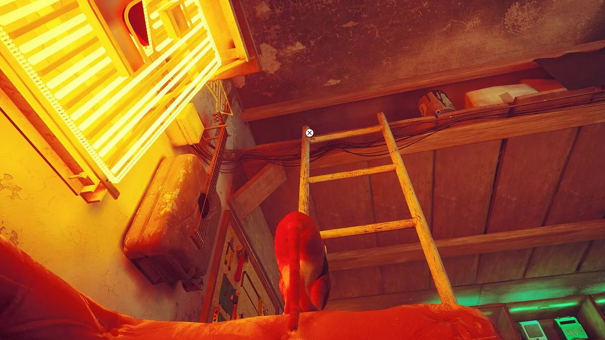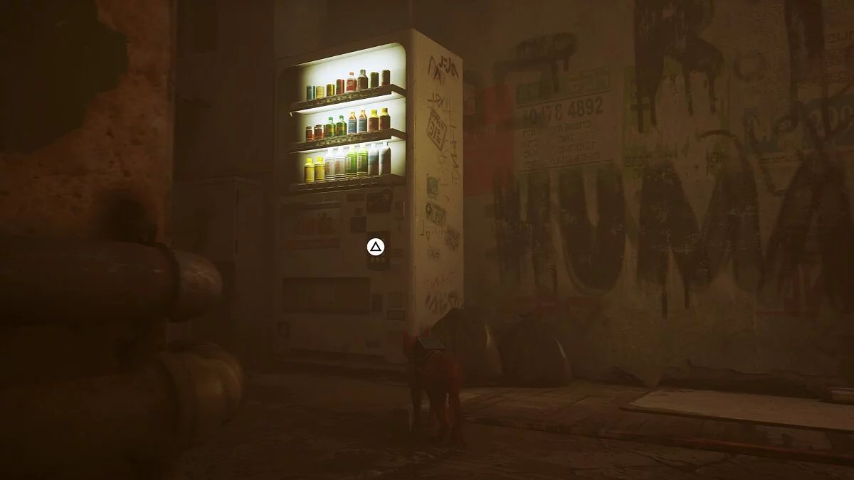 Возвращаемся по крышам обратно в центр города. На соседнем здании от лежащего на спине робота стоит диван. Забираемся на этот объект и спускаемся на один уровень ниже. Активируем красный торговый автомат, чтобы забирать энергетик.