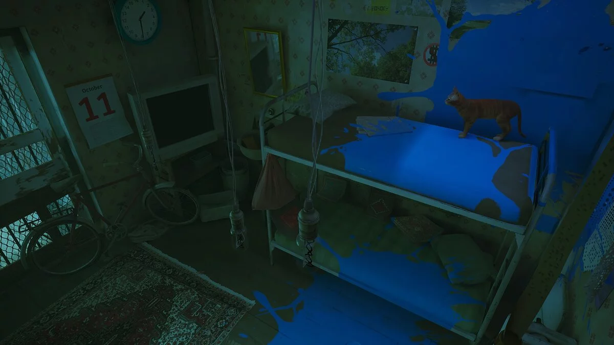 По сюжету котик доберётся до козырька крыши с банкой краски и сбросит её на стекло. После этого ему необходимо забраться внутрь и спрыгнуть на двухъярусную кровать. В этой комнате на полу несколько ковров, об которые можно поточить когти.