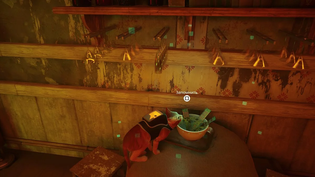 Царапаем ткань на окне, чтобы открыть лаз. Через него спускаемся в переулок. Справа от героя расположен бар. Проходим внутрь и поднимаемся по лестнице на второй этаж. Забираемся на ближайший стол слева и изучаем суп. Это действие откроет ещё одно воспоминание.