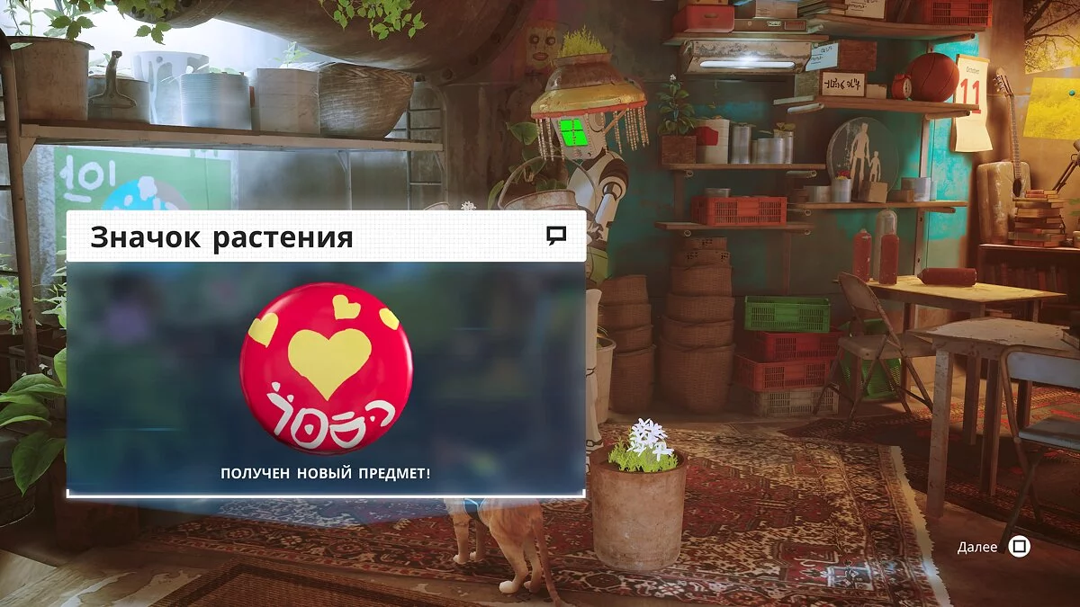 После сбора жёлтого цветка забираемся по лестнице наверх и разговариваем с роботом-садовником. Передаём ему три растения и получаем коллекционный предмет.