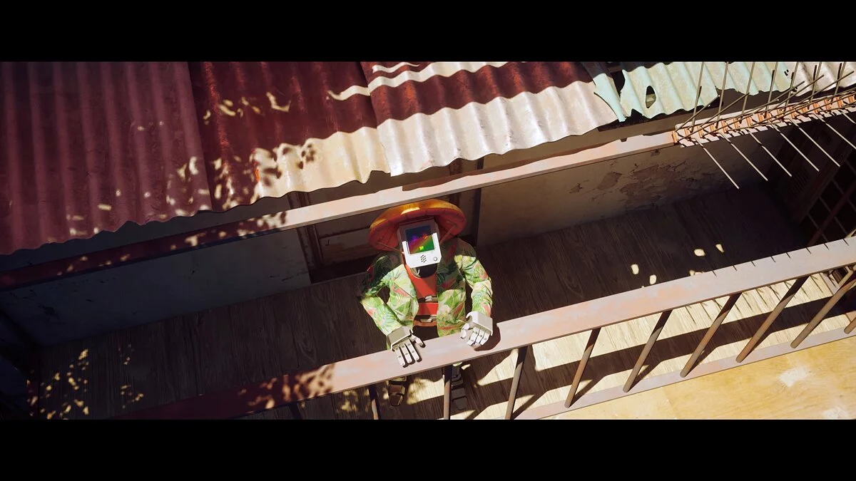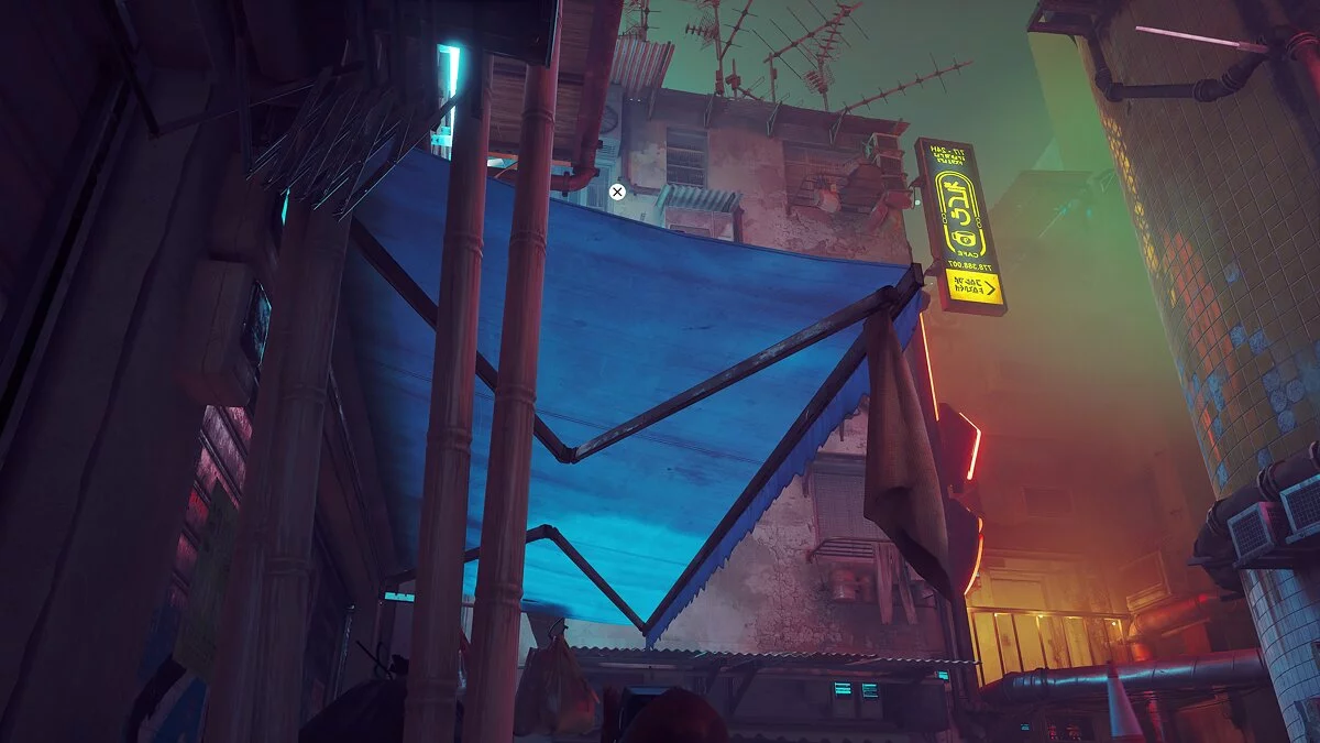 Следуем дальше по переулкам и находим робота Бабушку. На углу забираемся по кондиционерам и двигаемся по козырькам домов к длинному переулку. Обращаем внимание на висящую в воздухе деревяшку. Необходимо забраться на неё. Впереди заметим угол балкона. Запрыгиваем на него и активируем торговый автомат справа.