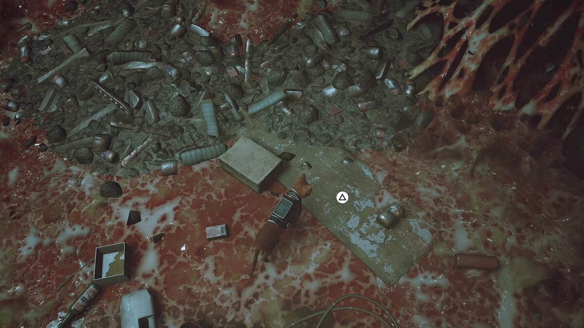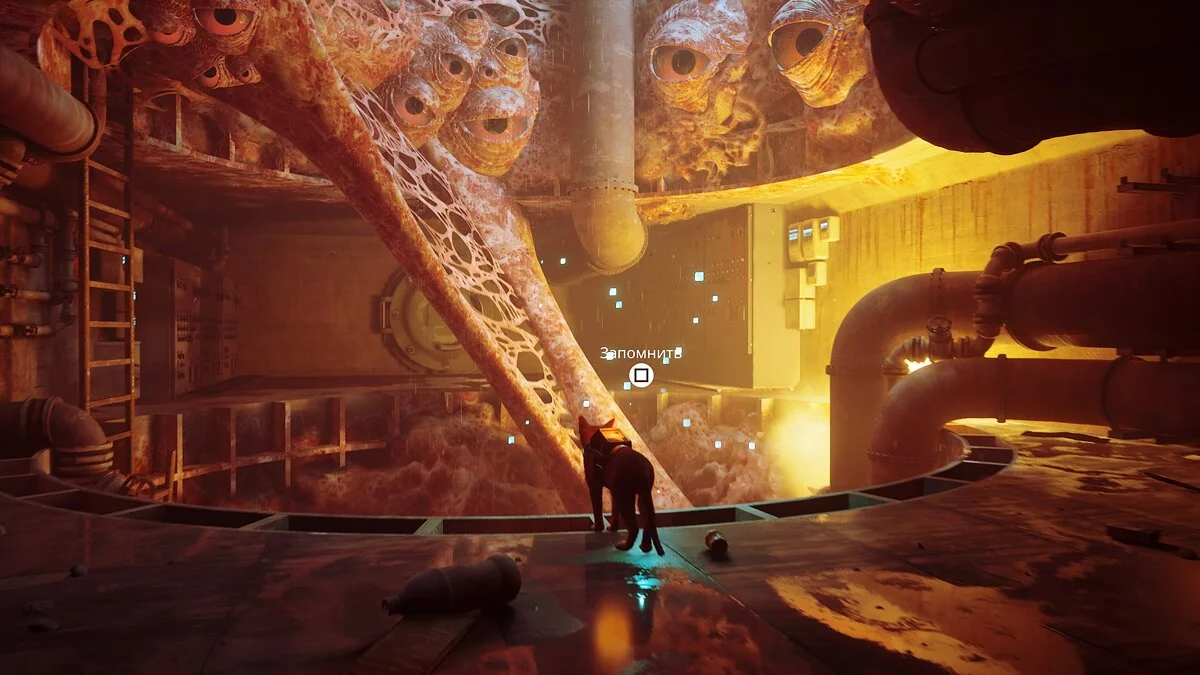 После получения воспоминания котик доберётся до большого шлюза с двумя терминалами и огромным количеством коконов. Активируем обе консоли и проходим через большую дверь. В этом помещении на полу с левой стороны лежит кусок картона. Здесь можно поточить когти.