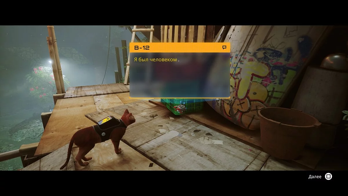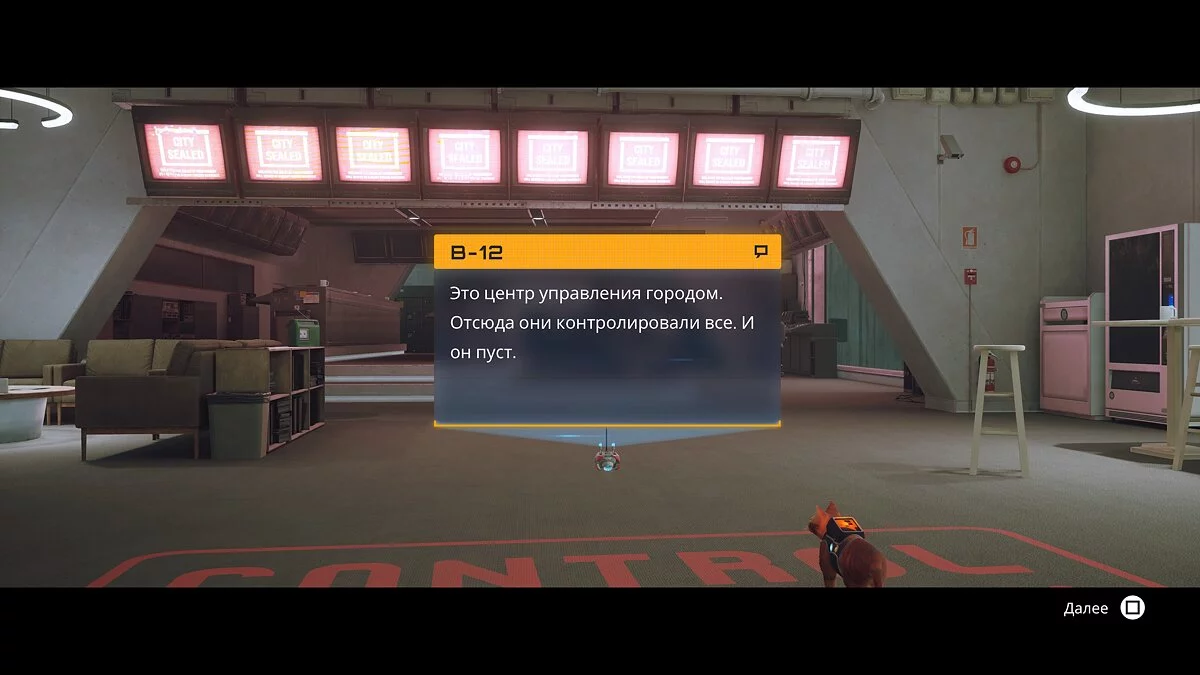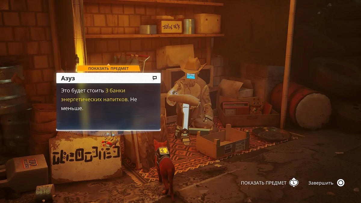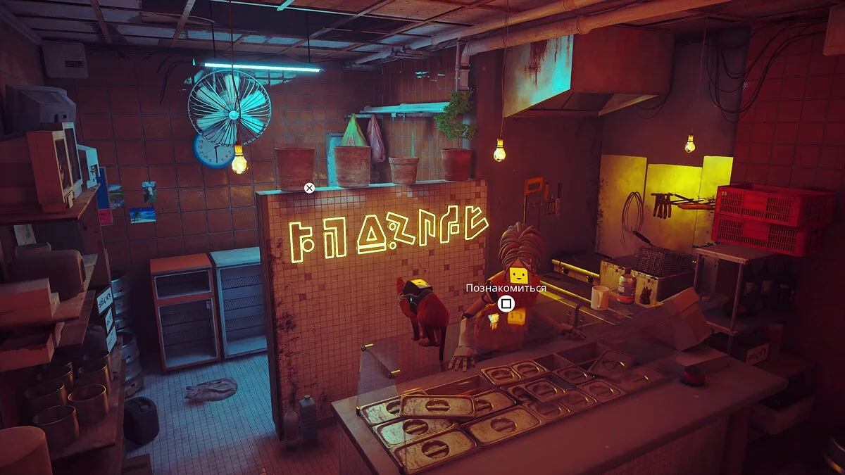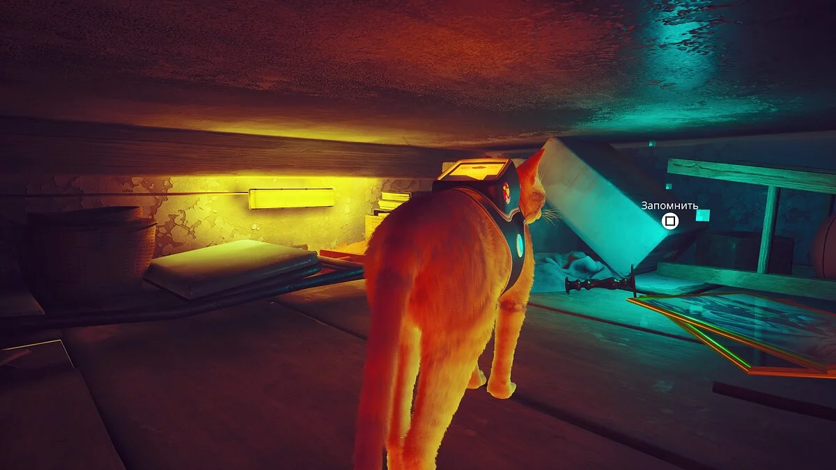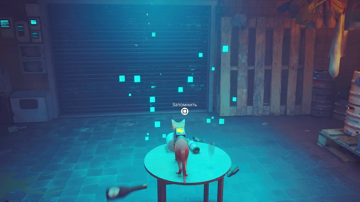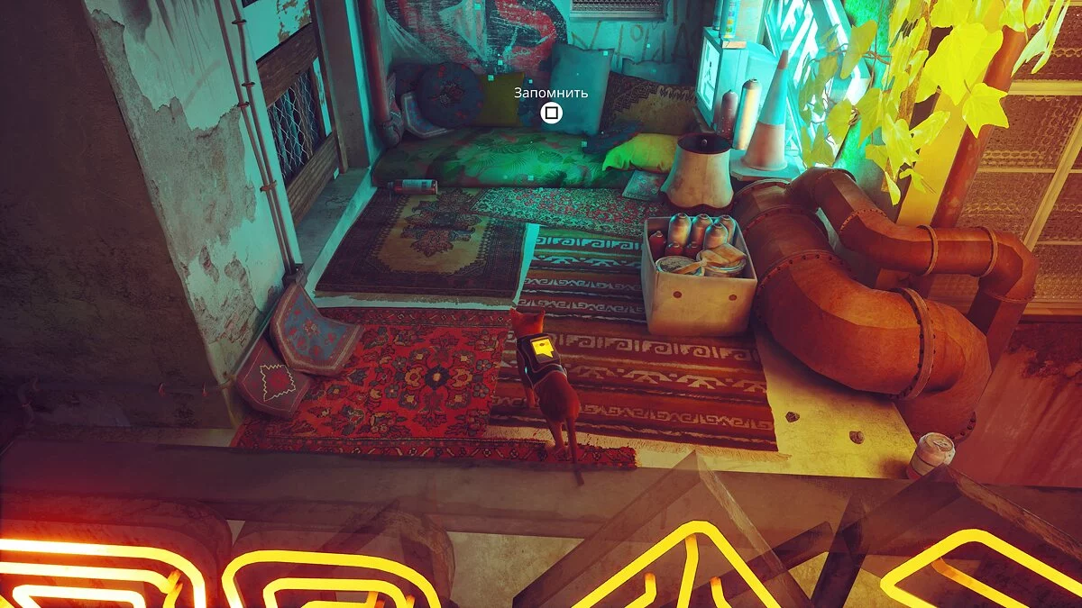 После выхода с фабрики котику нужно добраться до большой голограммы. Заходим в магазин с жёлтыми вывесками. Осматриваем на стене постер дрона для получения воспоминания.