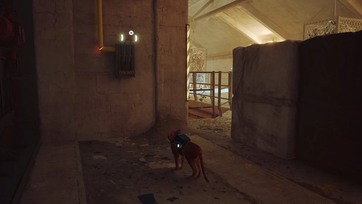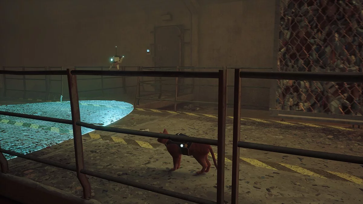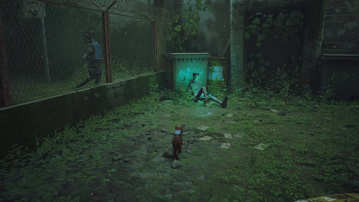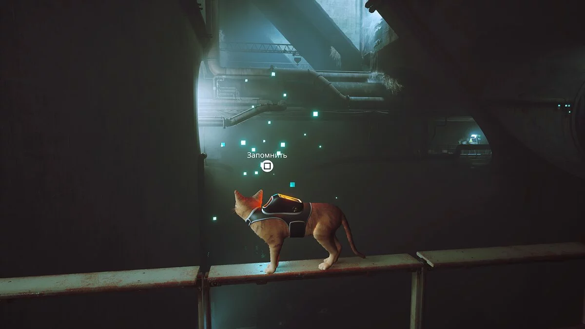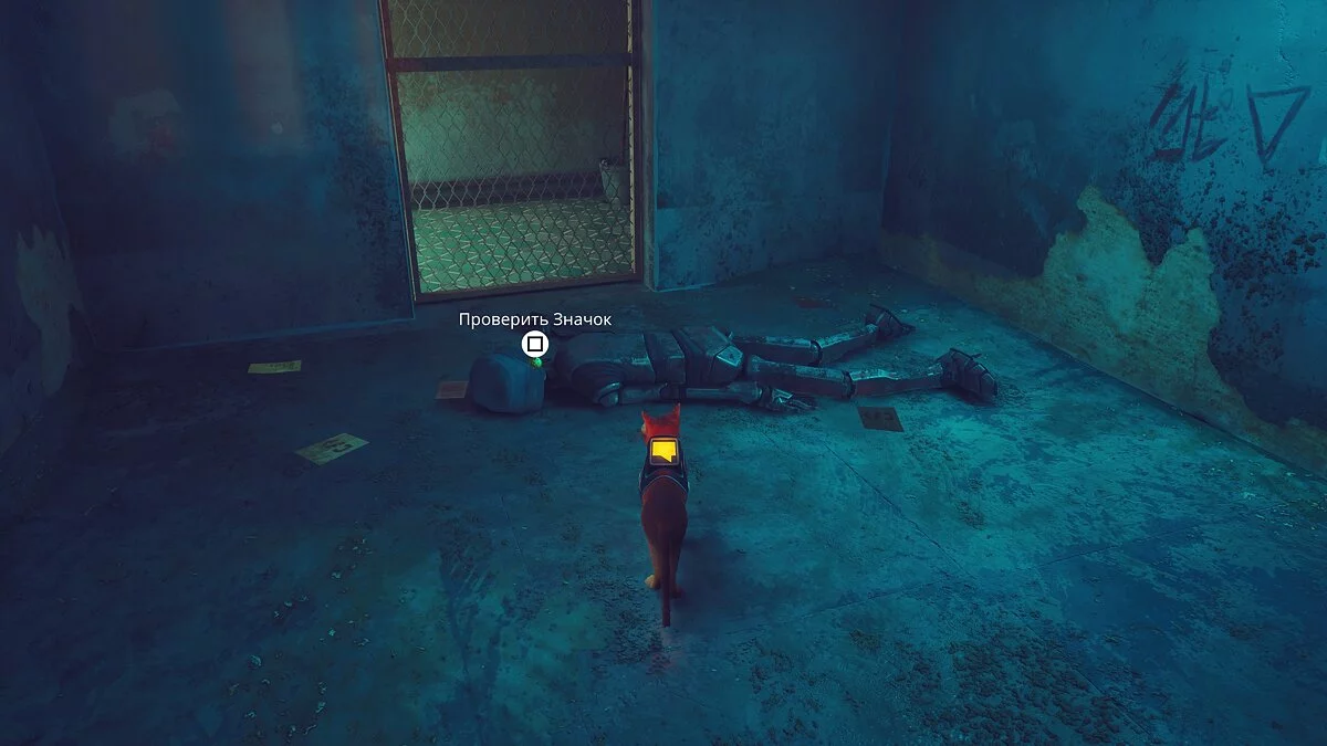 Возвращаемся обратно и спрыгиваем в канализацию. После погони котик воспользуется тележкой и упадёт с большой высоты. Идём вперёд к сломанному грузовику и забираемся наверх. От уступа двигаемся прямо через решётку, сворачиваем направо и осматриваем мёртвого робота, чтобы открыть воспоминание.