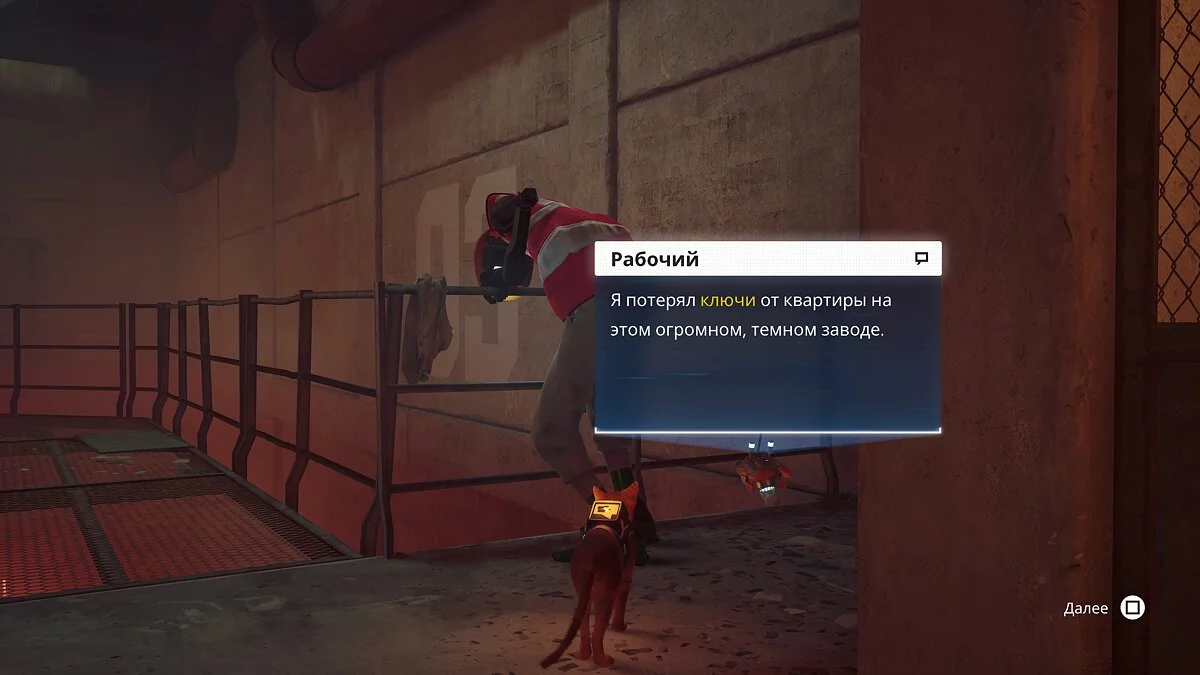 После выполнения сюжетных заданий котик окажется на фабрике. Проходим мимо трёх дронов и разговариваем с рабочим. Робот попросит принести потерянные ключи. Для этого нужно активировать рычаг и пройти в следующую секцию. Прячемся за движущимися контейнерами и добираемся до бочек мимо пятого и шестого дрона. Сразу же спрыгиваем на бочки справа и забираем ключи. Проходим немного вперёд, используем рычаг и добираемся до робота. При сборе всех коллекционных предметов из этой категории получим значок и одноимённое достижение.