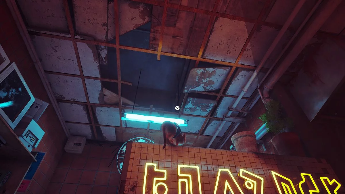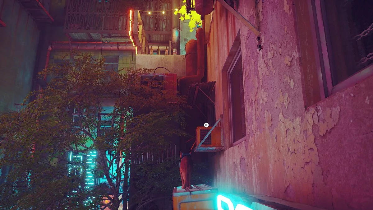 После встречи со второй группой Зурков котику придётся использовать балку и кондиционер, чтобы убежать от противников. От следующего уступа двигаемся прямо по платформам и забираемся ещё выше. Прежде чем развернуться и запрыгнуть на балку, необходимо пройти немного вперёд и осмотреть неоновую вывеску. Так вы получите коллекционный предмет.