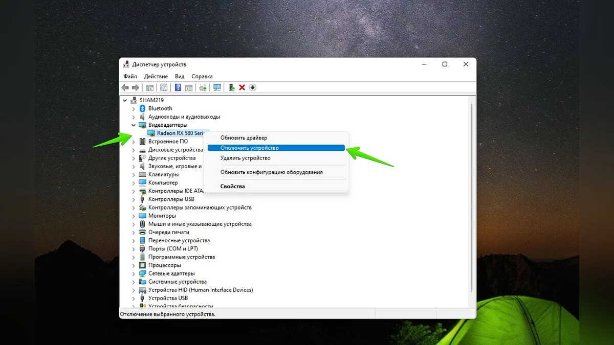 Откройте «Диспетчер устройств», выберите «Видеоадаптеры» и кликните ПКМ по видеокарте. Нажмите «Отключить устройство».