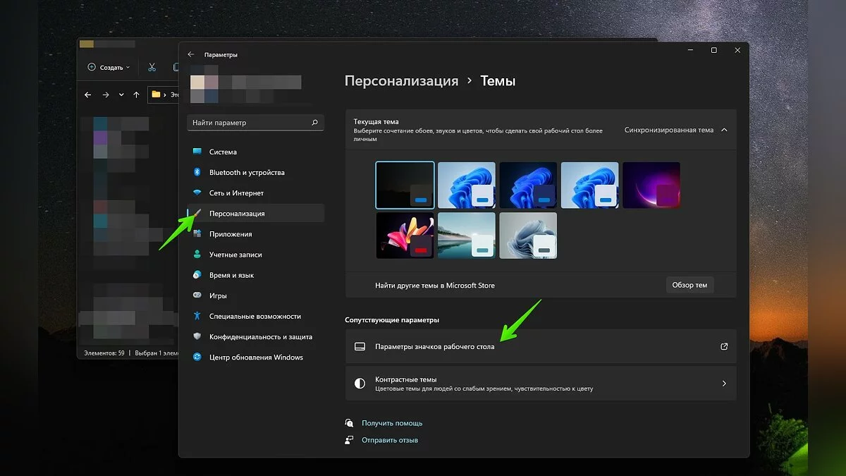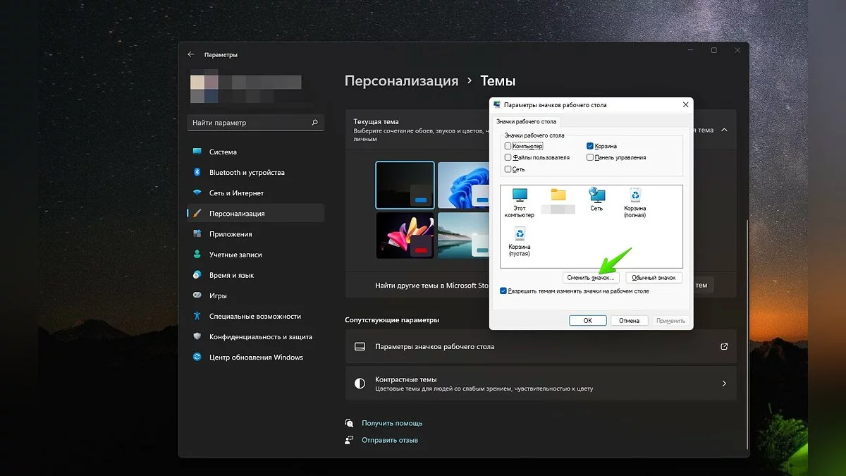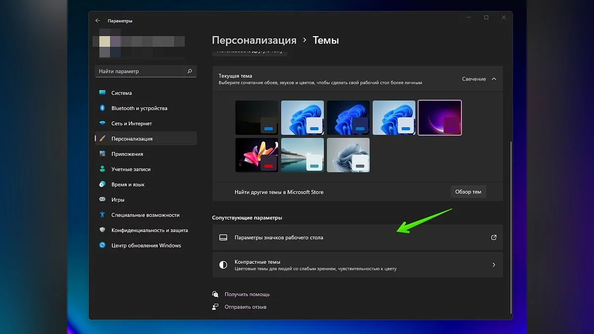 Запустите «Параметры» и перейдите по пути: «Персонализация» — «Темы» — «Параметры значков рабочего стола».