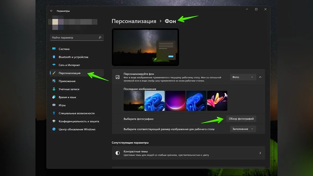 Кликните ПКМ на рабочем столе и перейдите в раздел «Персонализация» — «Фон». Нажмите «Обзор папок» и выберите необходимое изображение.