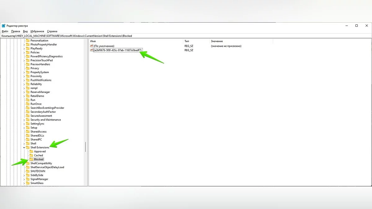 Кликните ПКМ по папке «Shell Extensions». Наведите курсор на пункт «Создать», затем «Раздел». Назовите его «Blocked» без кавычек.