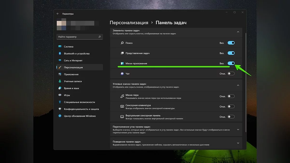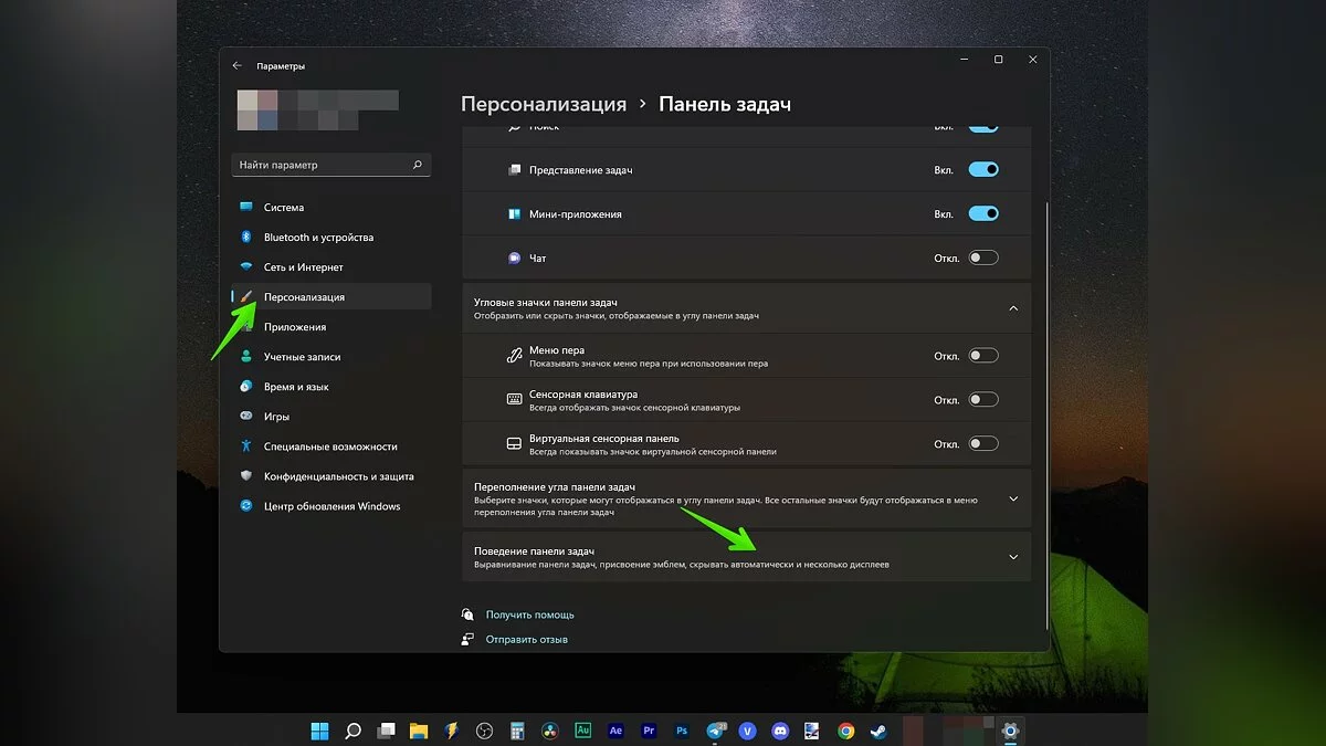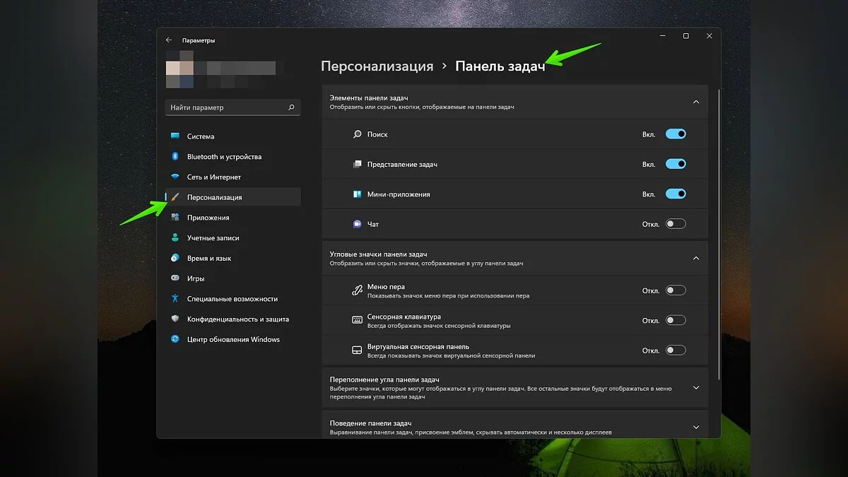 Зайдите в «Настройки» — «Панель задач» и перейдите в меню «Персонализация». Откроется окно «Элементы панели задач», в котором нужно отключить следующие параметры: