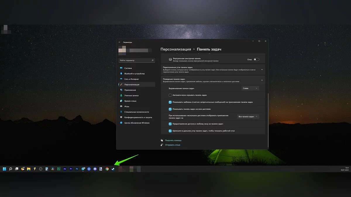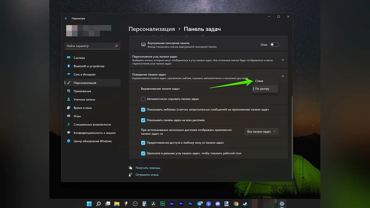 Вы увидите раздел «Выравнивание панели задач». По умолчанию здесь установлено значение «По центру». Замените его на параметр «Слева».
