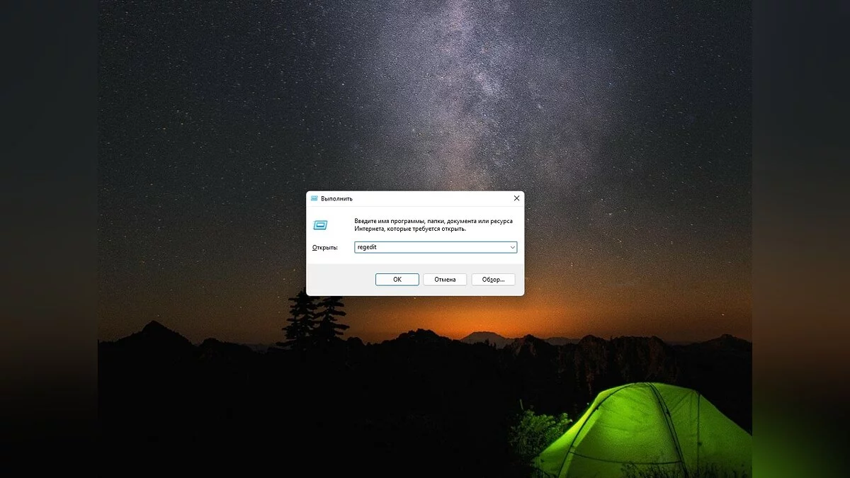 На клавиатуре зажмите кнопки «Win+R» для открытия окна «Выполнить». Скопируйте «regedit» без кавычек, вставьте текст в открывшееся окно и кликните «OK».