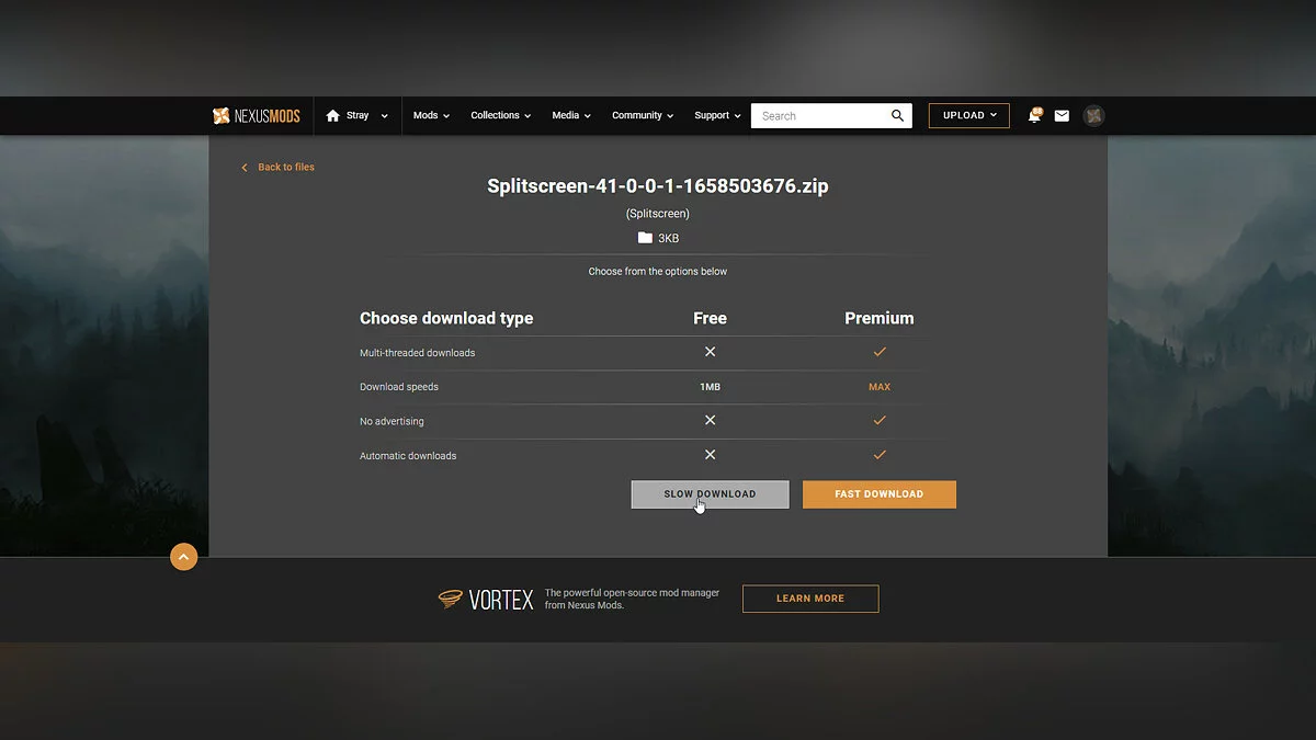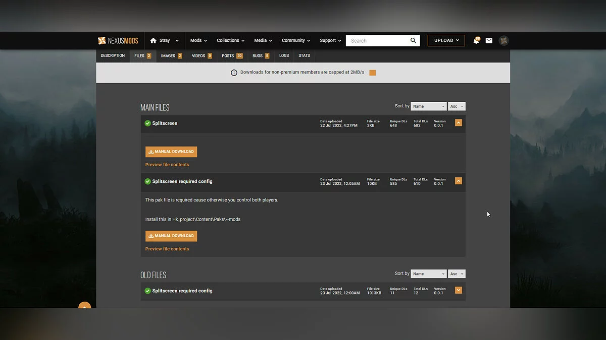Перейдите по ссылке к модификации Splitscreen на Nexus Mods. Для скачивания улучшения обязательно необходимо пройти авторизацию или регистрацию на сайте, иначе доступ к загрузке будет закрыт.