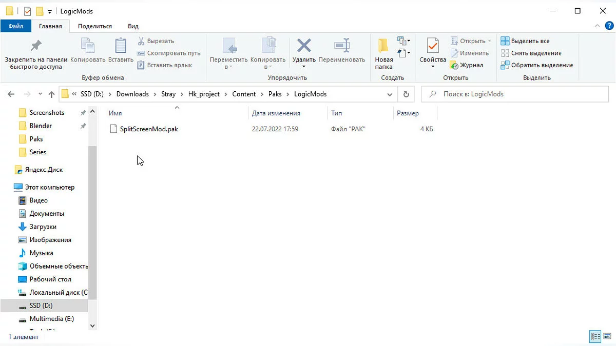 Здесь же создайте папку LogicMods и откройте её. Внутрь папки LogicMods поместите файл SplitScreenMod.pak.