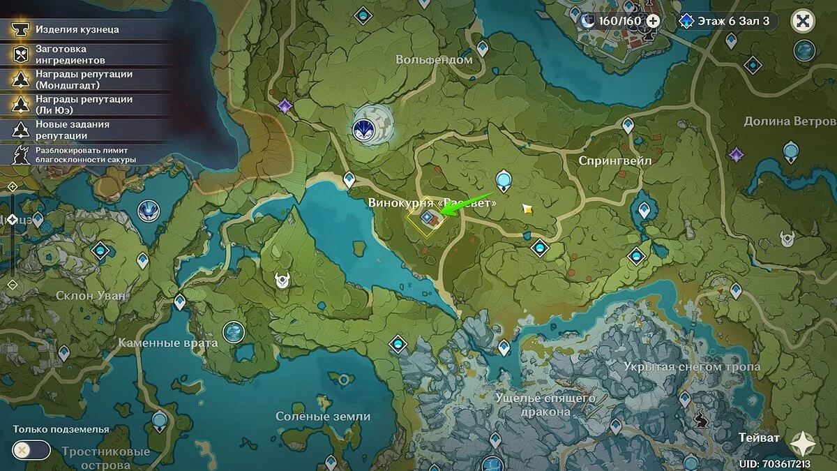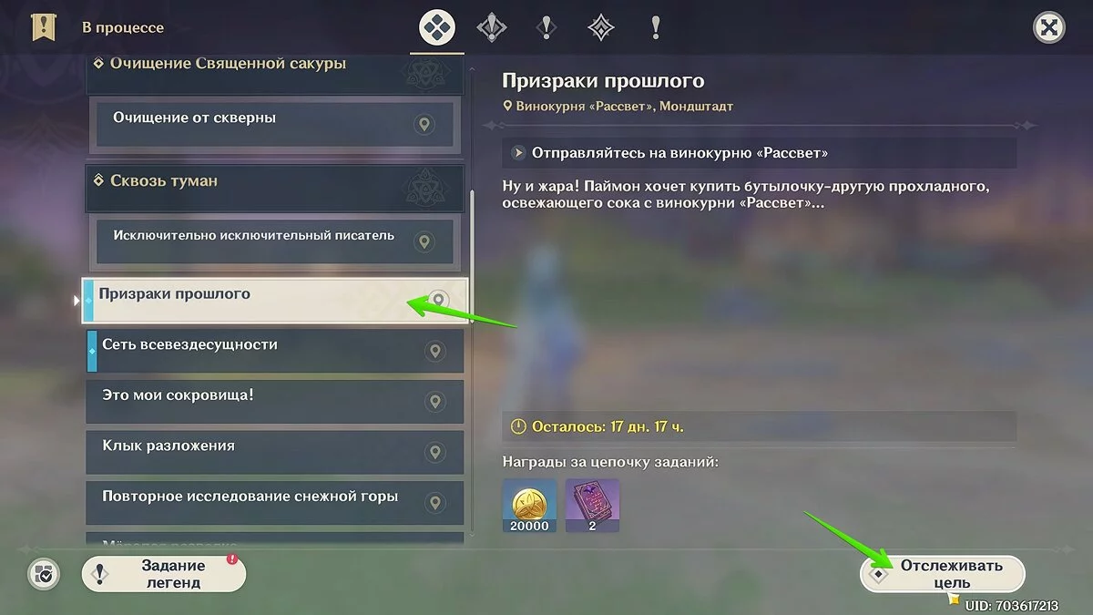 Откройте журнал задач, найдите квест «Призраки прошлого» в списках доступных заданий и нажмите «Отслеживать цель». Вам необходимо переместиться на Тейват, к винокурне «Рассвет».