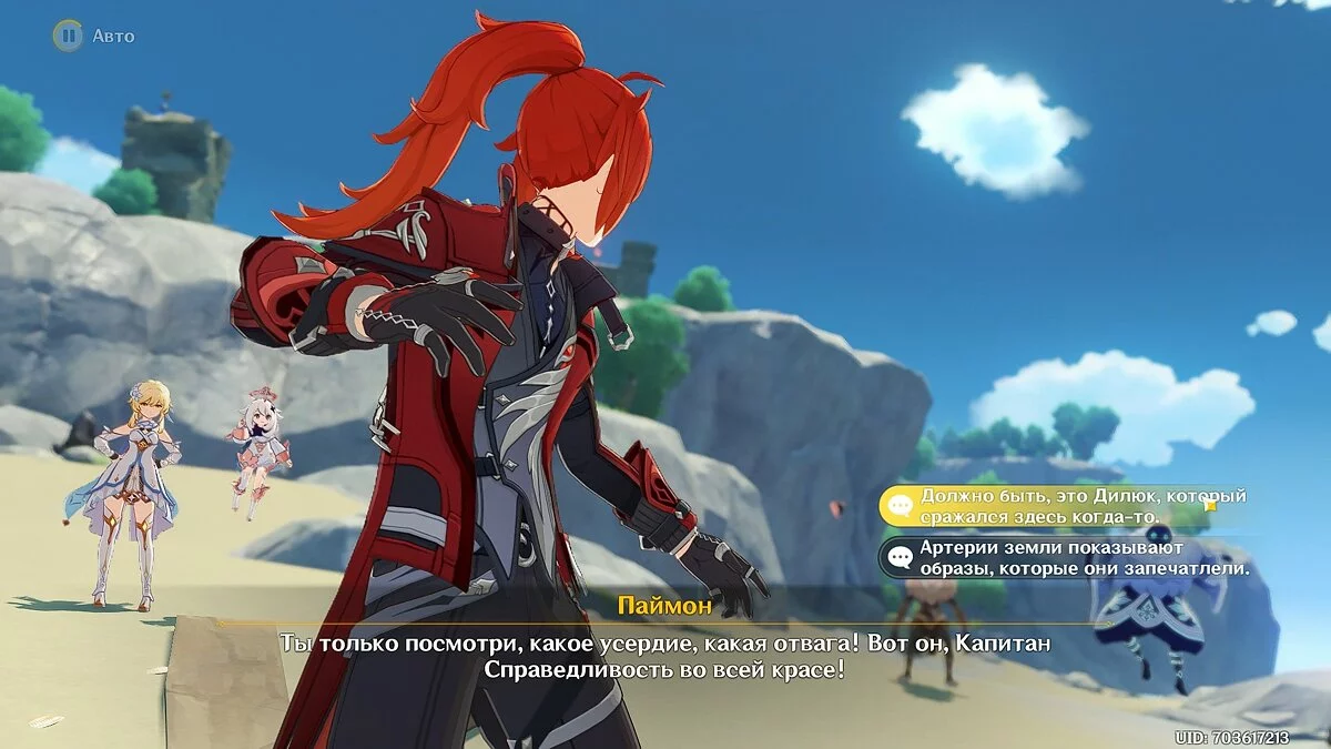 После диалога Паймон и Путешественника на пляже появится аномальный застой артерий Земли. Как только вы приблизитесь к нему, запустится кат-сцена. Вы увидите несколько хиличурлов и мага Бездны, после чего появится Дилюк. Управление перейдёт к владельцу винокурни.