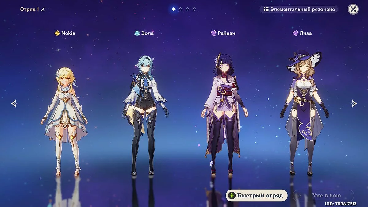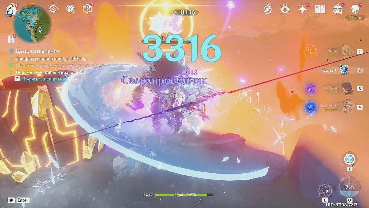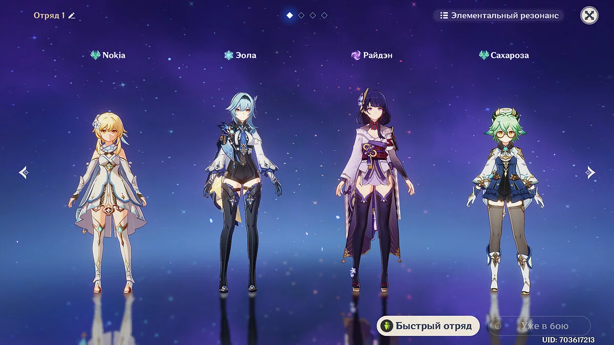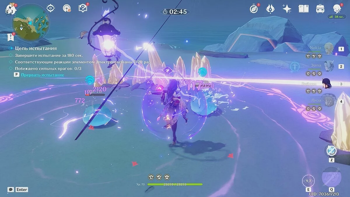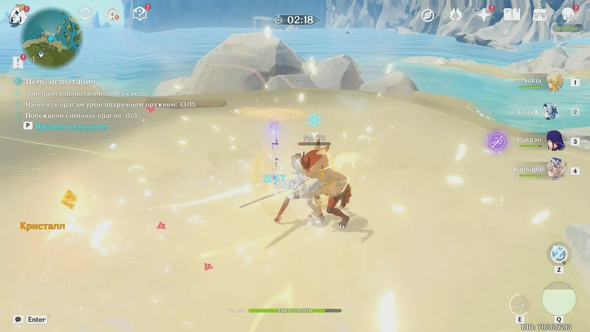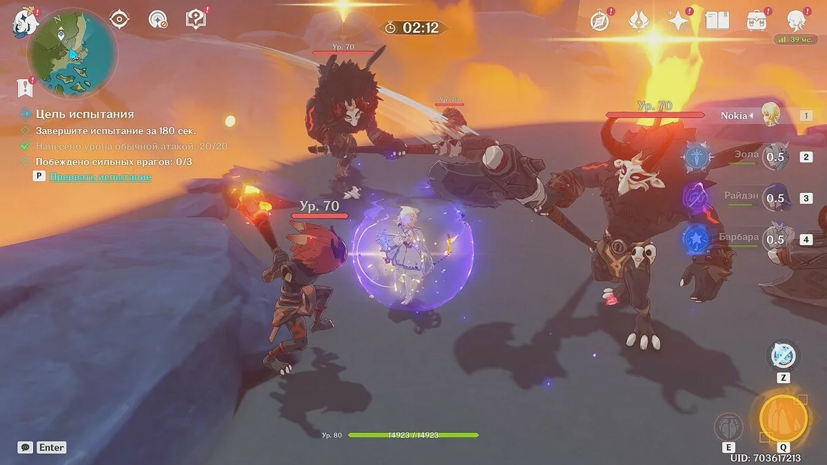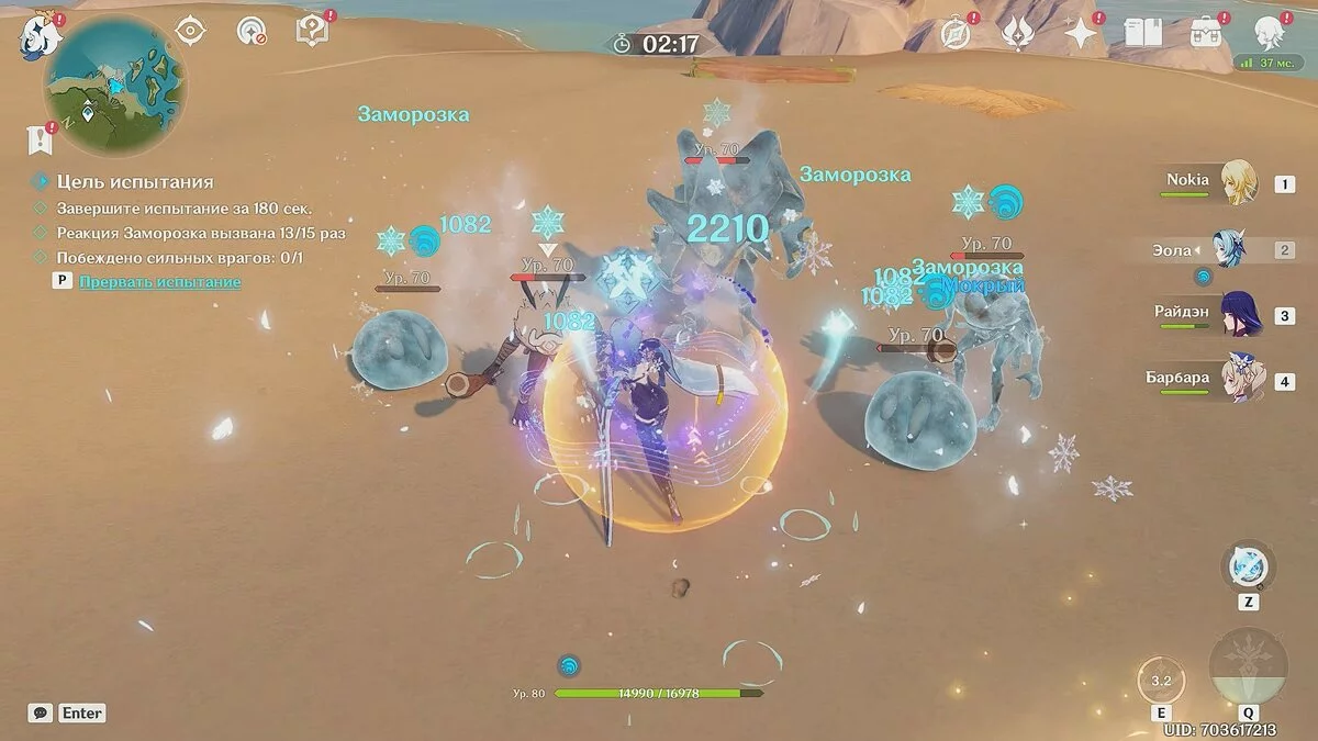Мы экипировали Эолу (Крио) и Барбару (Гидро), но вы вправе выбрать других бойцов. Сперва атакуйте врагов стихией «Гидро», чтобы присвоить им статус «Мокрый». После этого замораживайте их Крио-персонажем.