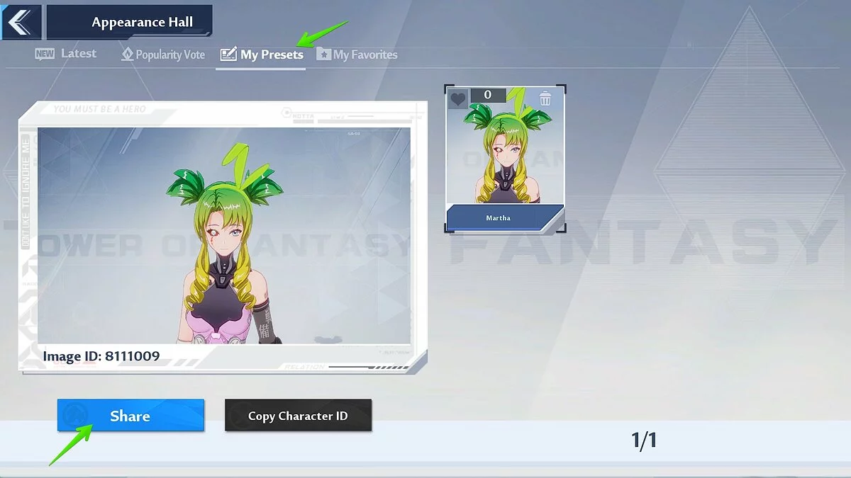 Lobby — здесь вы можете делиться своими пресетами с другими игроками, а также загружать доступные настройки кастомизации пользователей. Чтобы поделиться, откройте вкладку My Presets и нажмите кнопку Share. Если ваш пресет понравится другим игрокам, то наберёт много лайков и попадёт во вкладку Popularity Vote.