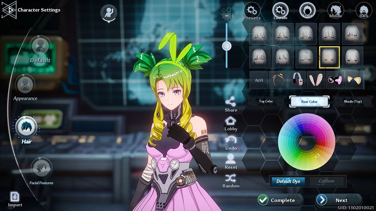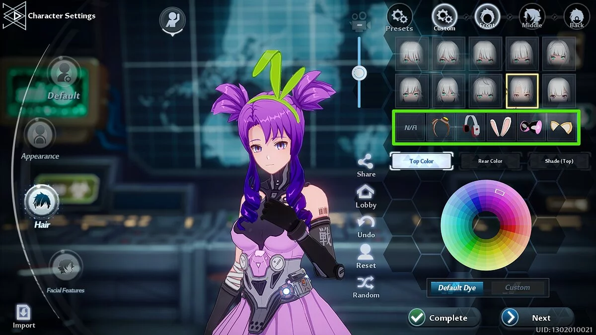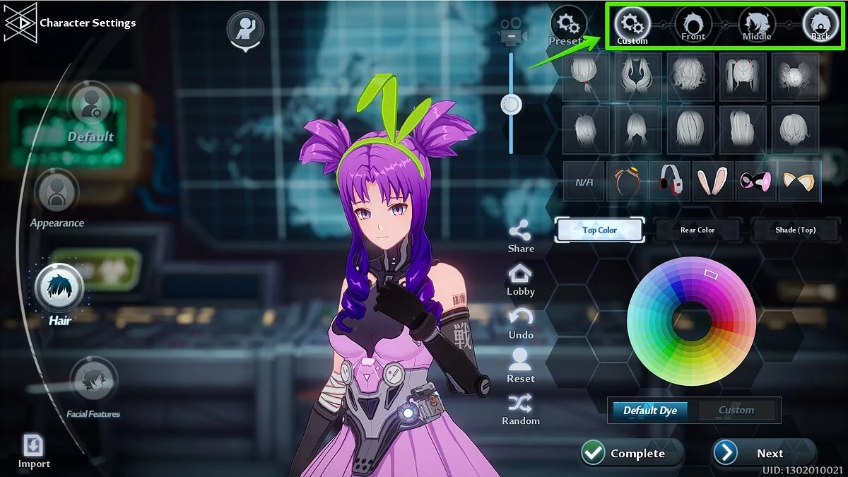 Если вы хотите выбрать доступный пресет, нажмите на кнопку Presets и кликните по одному из них. Рядом вы заметите другие вкладки: Custom, Front, Middle и Back. Используйте их для тонкой настройки причёски героя.