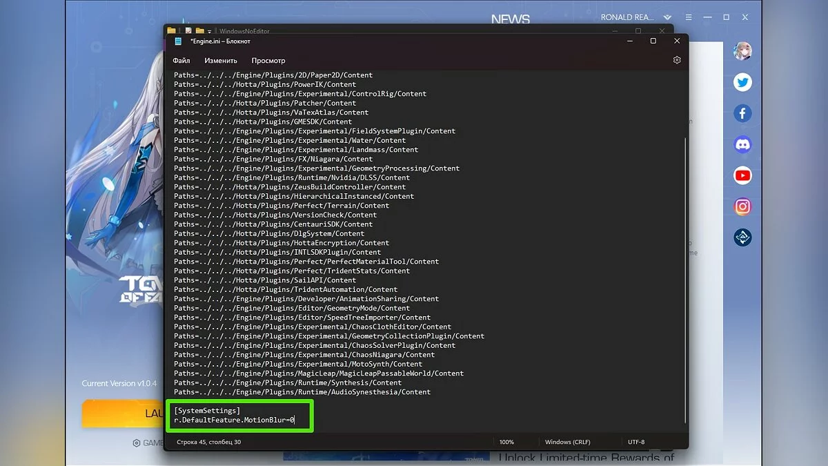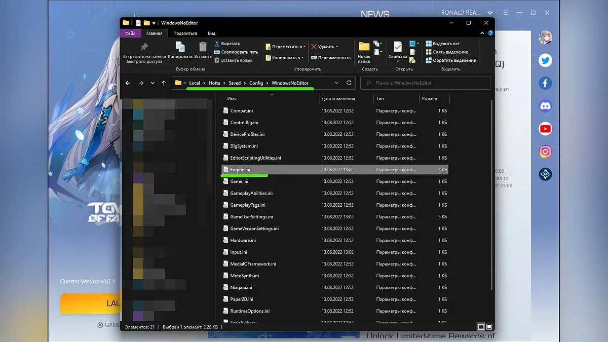 Следуйте по пути: «Hotta\Saved\Config\WindowsNoEditor». В этом каталоге вы найдёте файл конфигурации Engine.ini. Откройте его при помощи блокнота или другого текстового редактора.