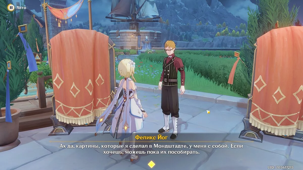 По завершении квеста вы окажетесь в Мондштадте, где снова встретите Феликса Йога из Кур-де-ля-Фонтейна. Никаких дополнительных действий делать не нужно — рядом с мужчиной находятся две картины, с которыми вы можете взаимодействовать.