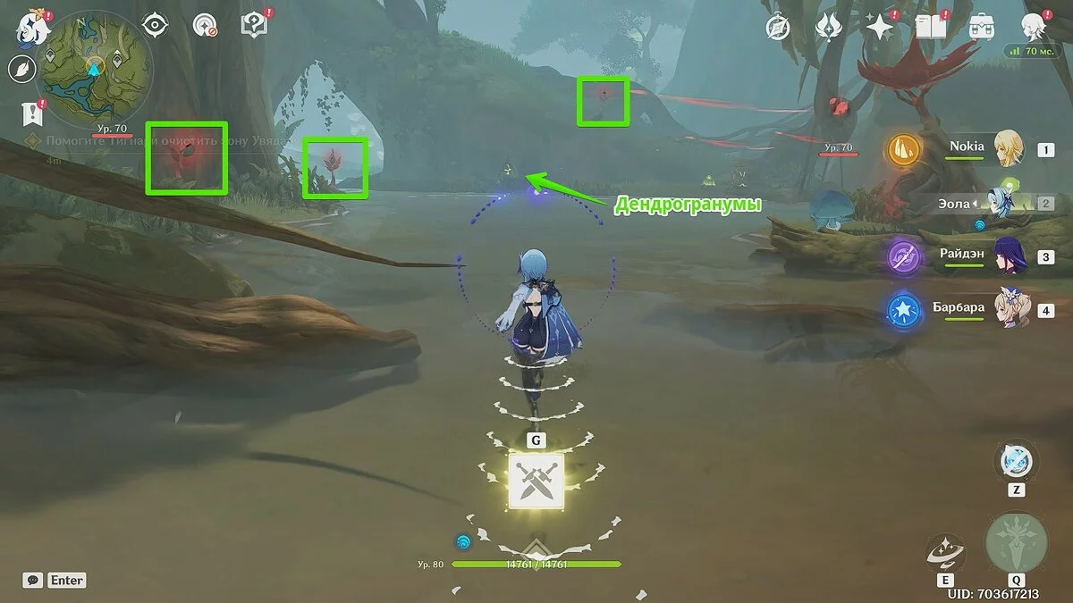 Добравшись сюда, вы заметите несколько заражённых ветвей и одну опухоль. Сперва нужно ликвидировать ветви при помощи дендрогранумов. Это зелёное вещество, разбросанное по региону. Соберите его, после чего подойдите к заражённой ветви и используйте заряженную атаку любым героем (нужно зажать клавишу атаки).